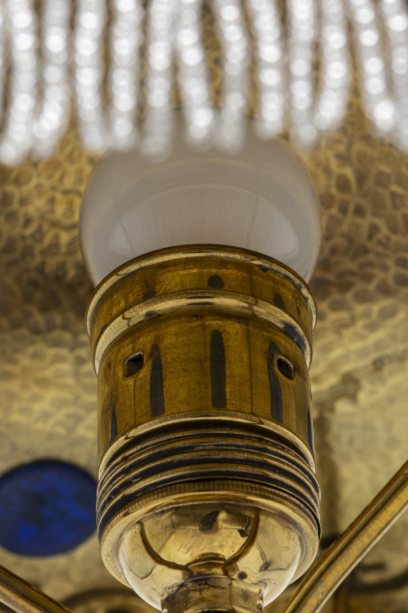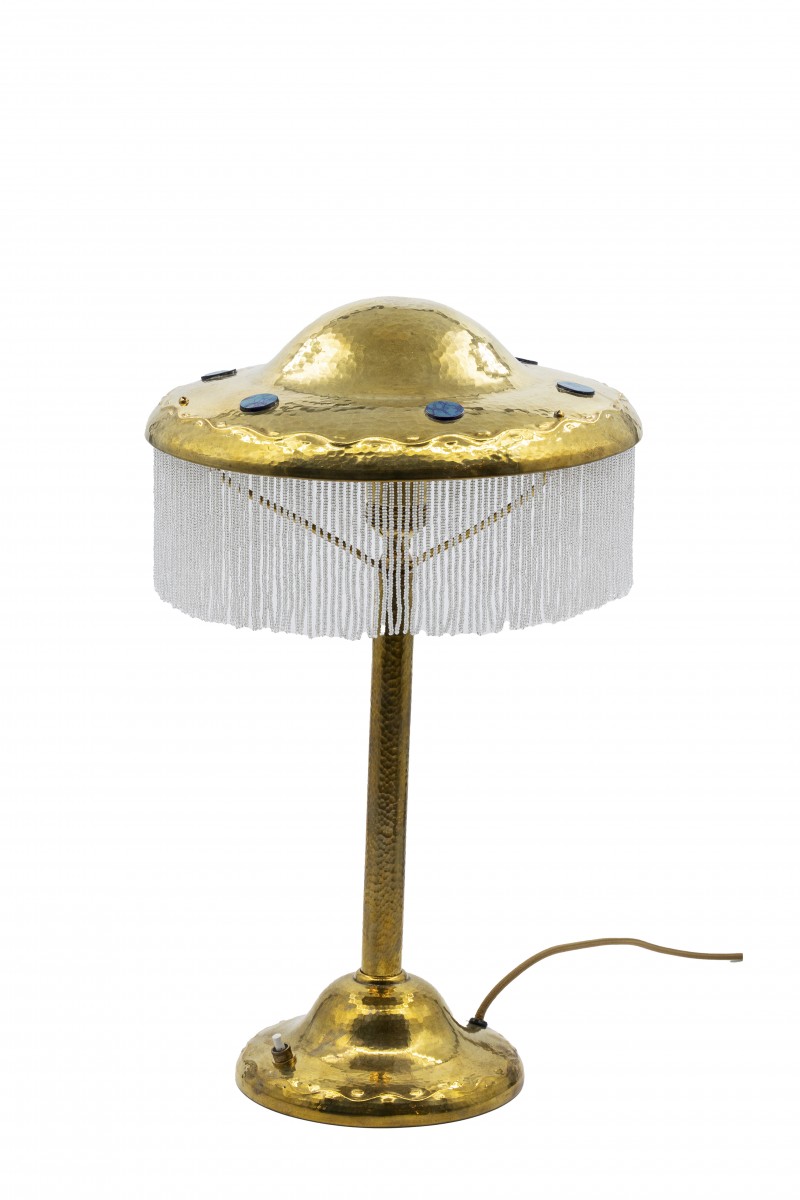 As a teacher at the Vienna School of Arts and Crafts, Josef Hoffmann taught some very talented architects and designers. His distinctive style influenced several generations of artists and continued to have an impact in the world of design for a long time. This table lamp was probably designed by one of Josef Hoffmann’s students. Emanuel Josef Margold in particular was known to use wavy ornaments like those running around the lamp shade edge. The material used and the “hammer stroke decoration” on the brass are also typical stylistic features of Josef Hoffmann.