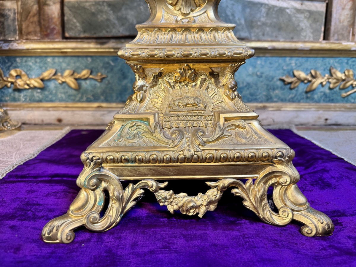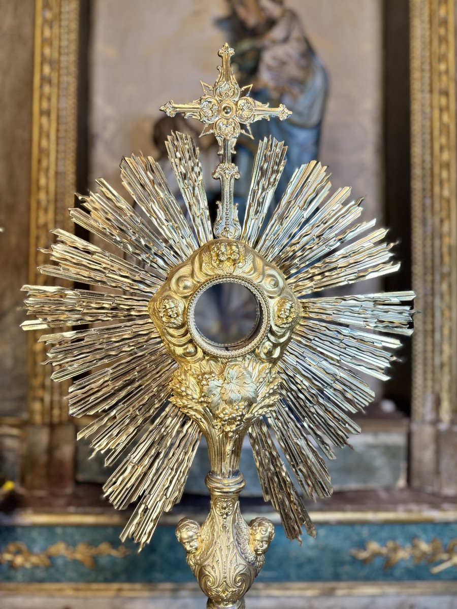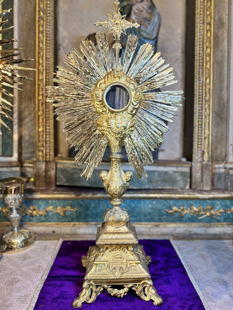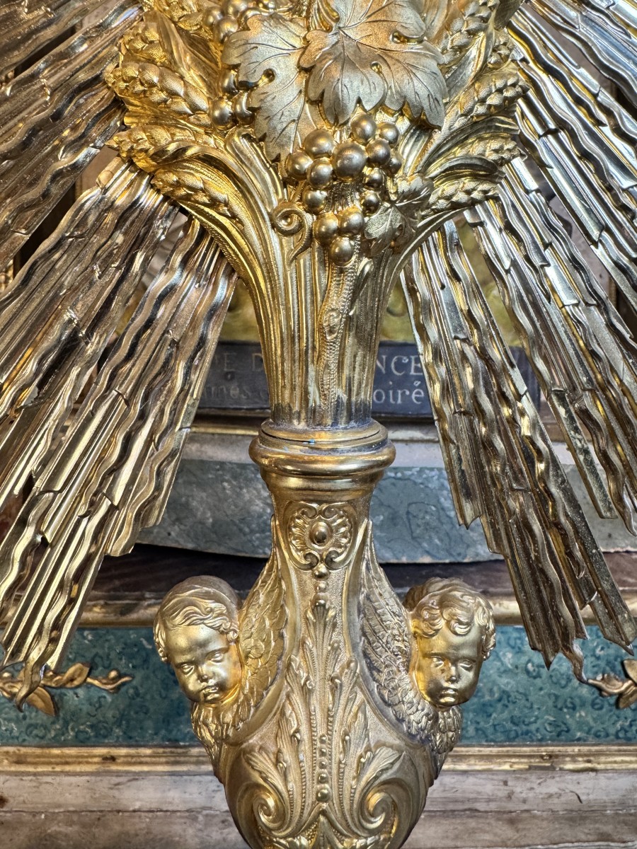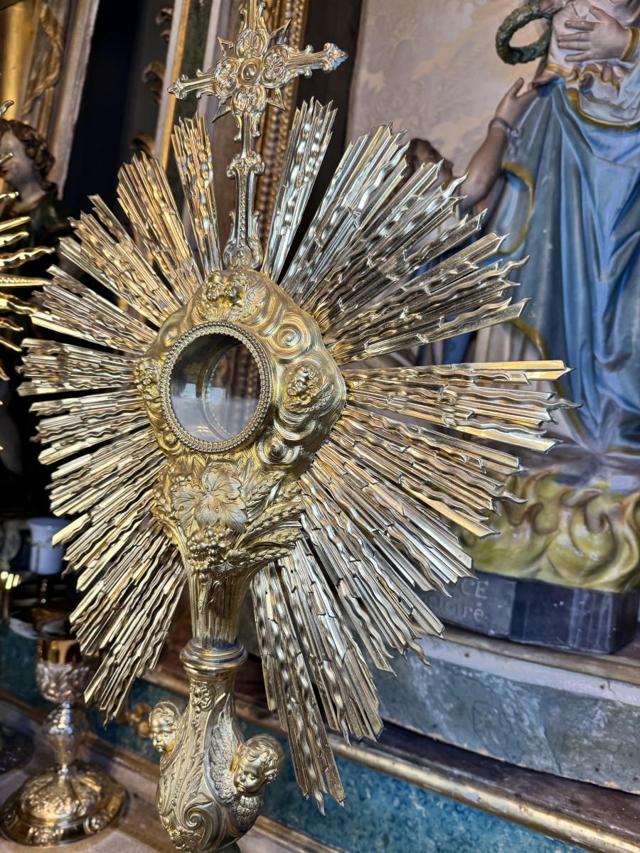 An interesting piece, especially for its large dimensions because it is rare to find monstrances for sale that are more than 80 cm. Our monstrance is made of gilded brass worked in matt and shiny, with finely chiseled figurines of angels, cherubs and classic Eucharistic symbols.