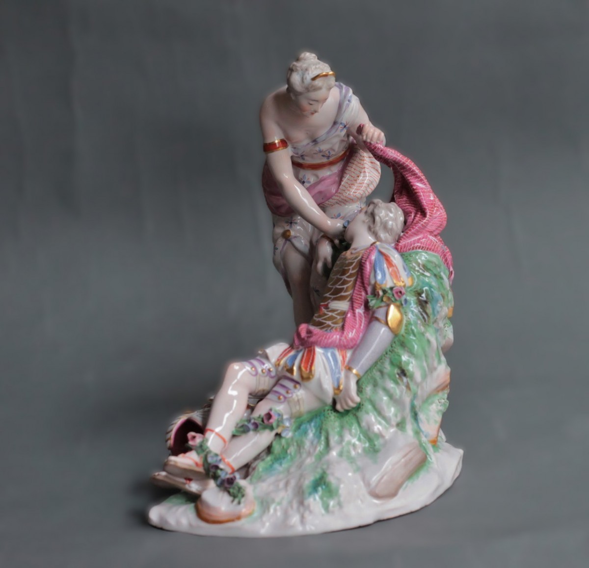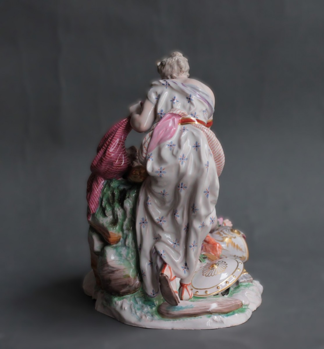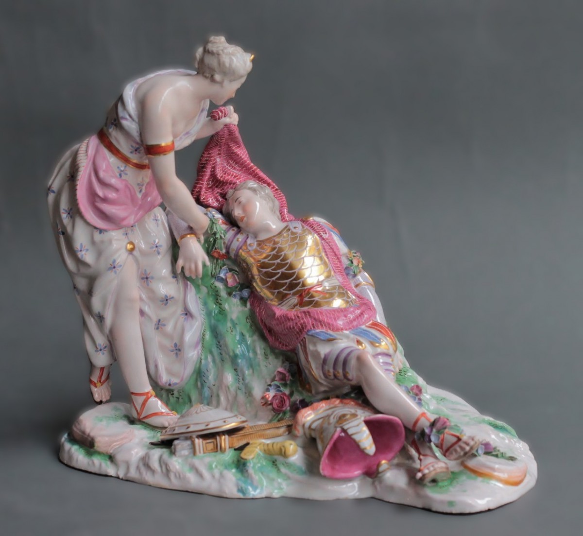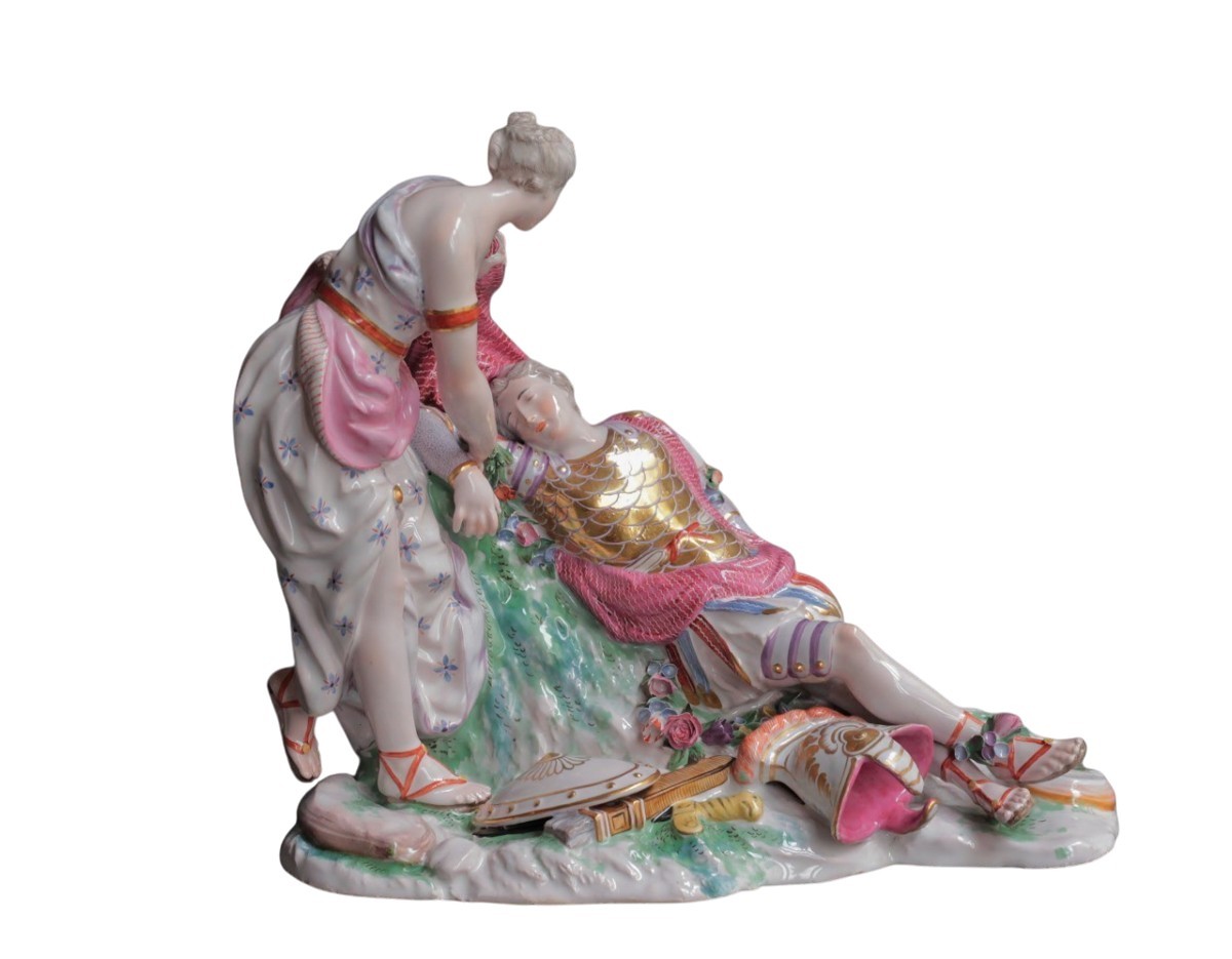 Niderviller earthenware group with polychrome and gold decoration depicting Renaud and Armide* on a terrace: Renaud reclining surrounded by his helmet, arms and shield, Armide standing supporting him, after a model by Cyfflé.