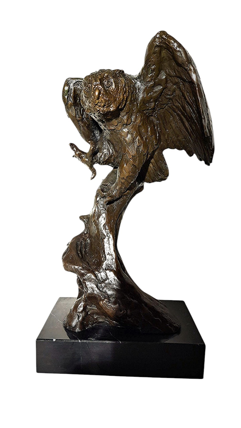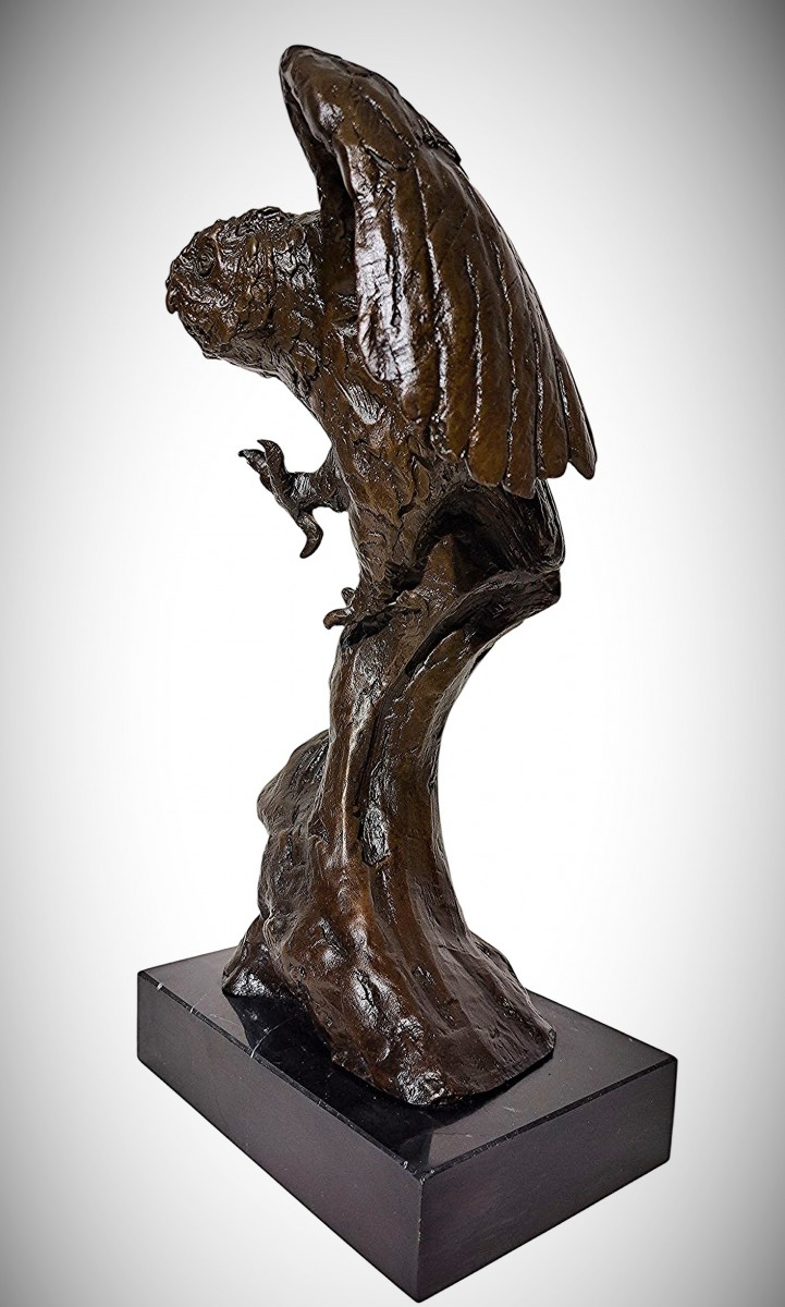 Japanese bronze depicting an owl about to take off from a branch. On a black marble stand. Circa 1930.