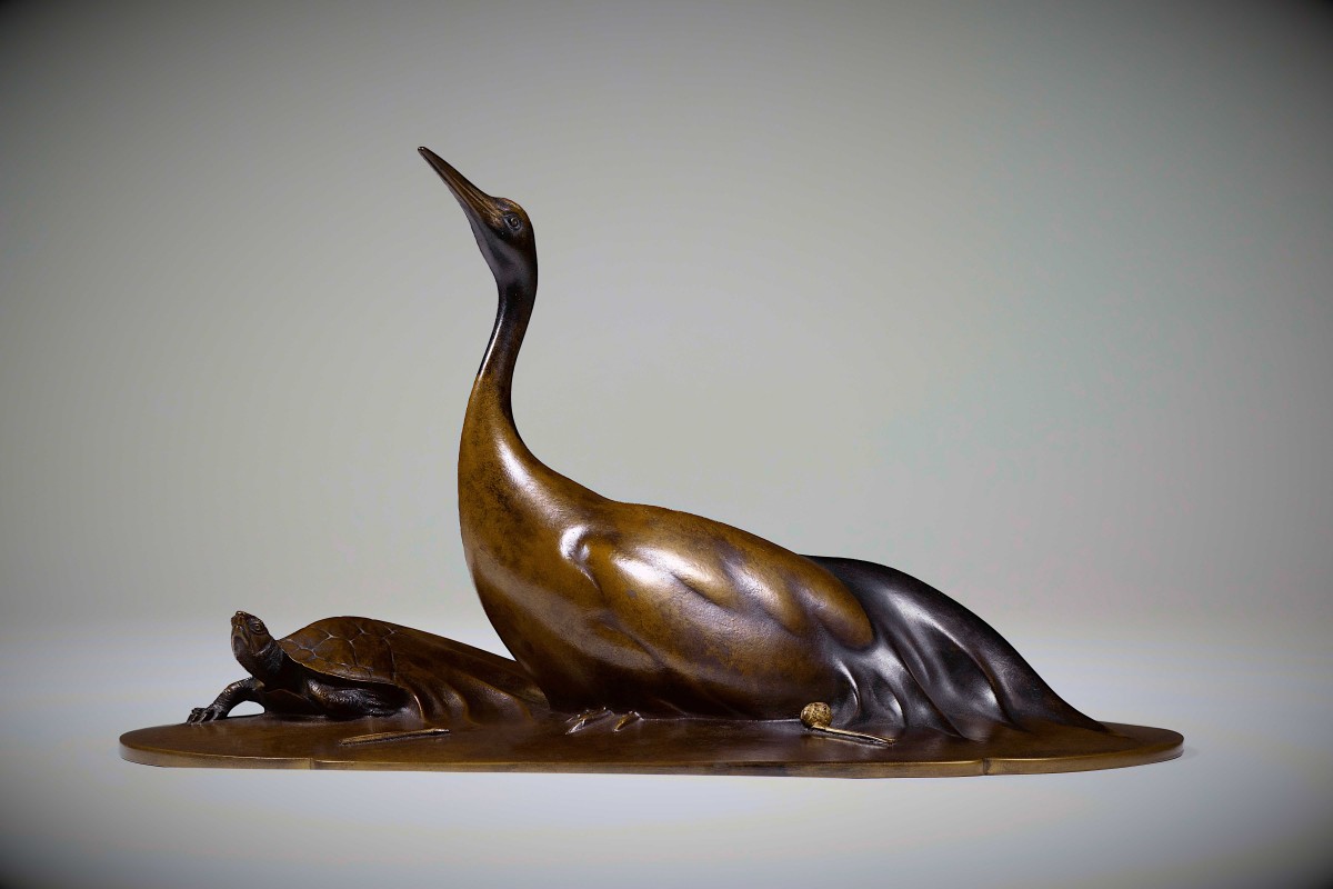 Both decorative and deeply symbolic, this bronze exemplifies the refined aesthetic of early 20th-century Japanese sculpture, in which technical mastery and ancient iconography are brought into perfect harmony. A work of outstanding quality, ideally suited to an important collection of Japanese art or a sophisticated interior seeking an emblematic object of serenity and permanence.