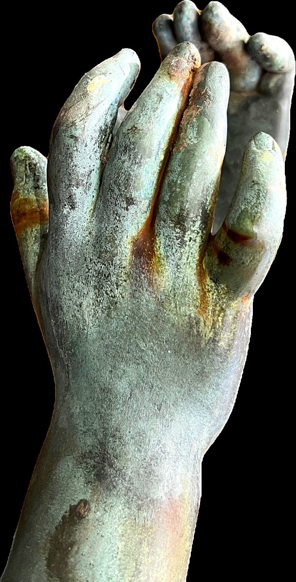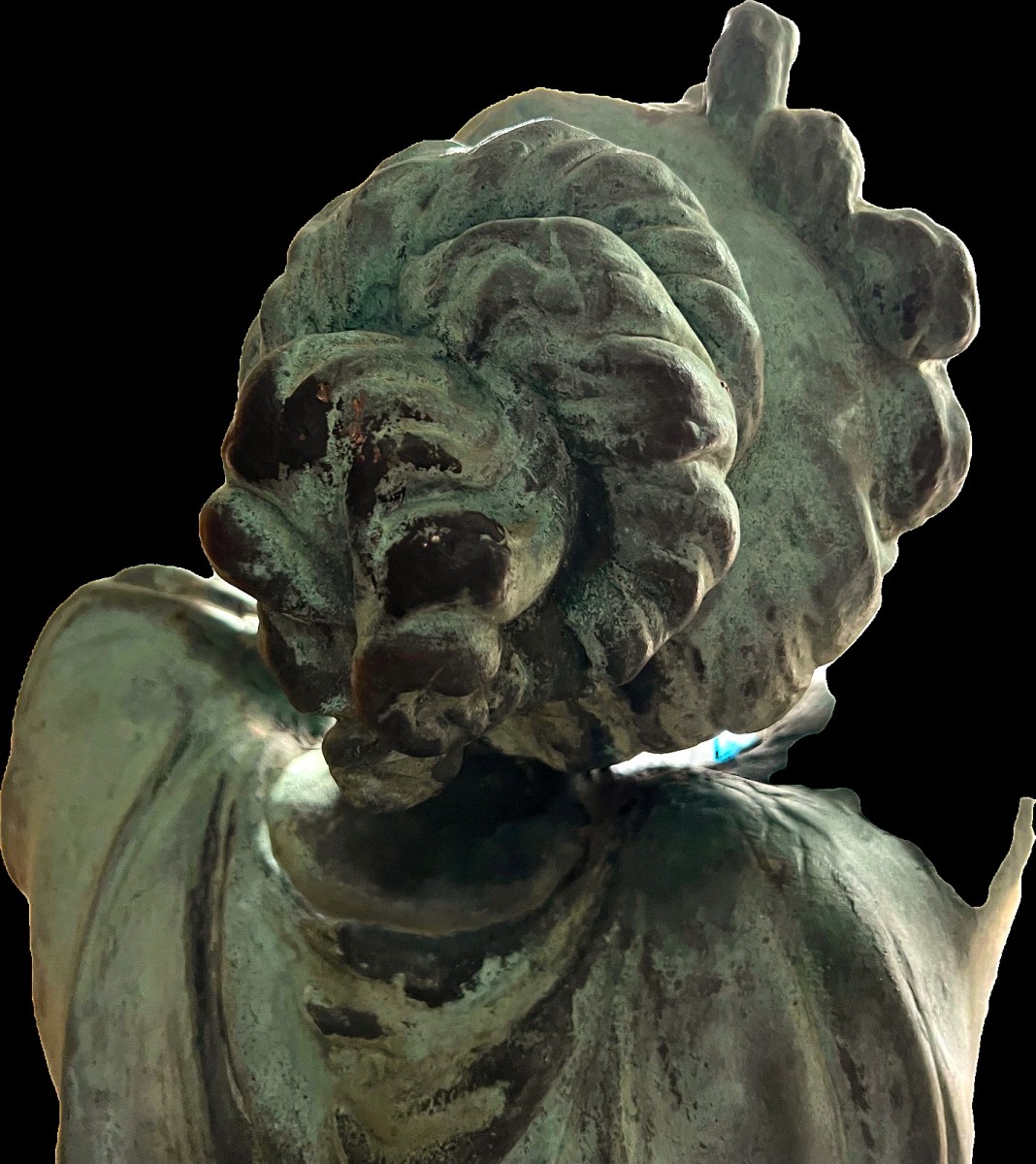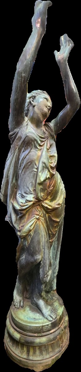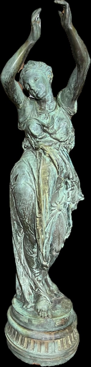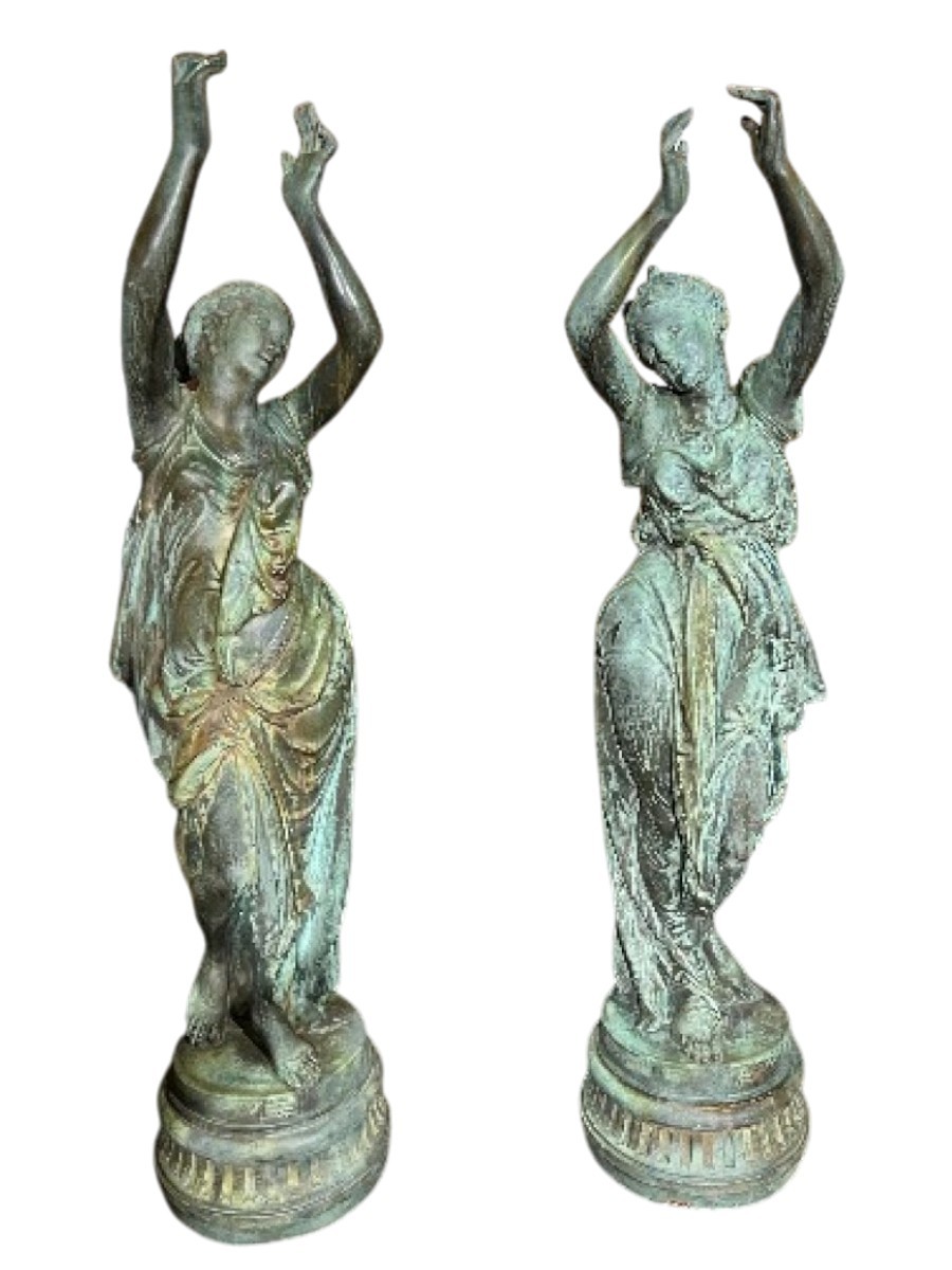At the end of the 19th century, Antoine Durenne's foundry developed a process for ennobling cast iron using a copper coating applied by electrolysis. This technique was extremely rare for Durenne. The statues represent vestals with elegant movements who, originally, still held vases or drums and triangles in their hands. The drawing is by Étienne Henri Dumaige (1830-1888). On the base, they bear the plaque: "A. Durenne, Master of Forger, Sommevoire, Hte Savonne". The statues have a magnificent natural patina and have been preserved accordingly during the recent restoration.