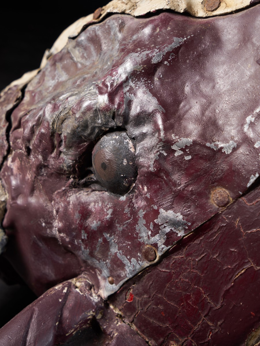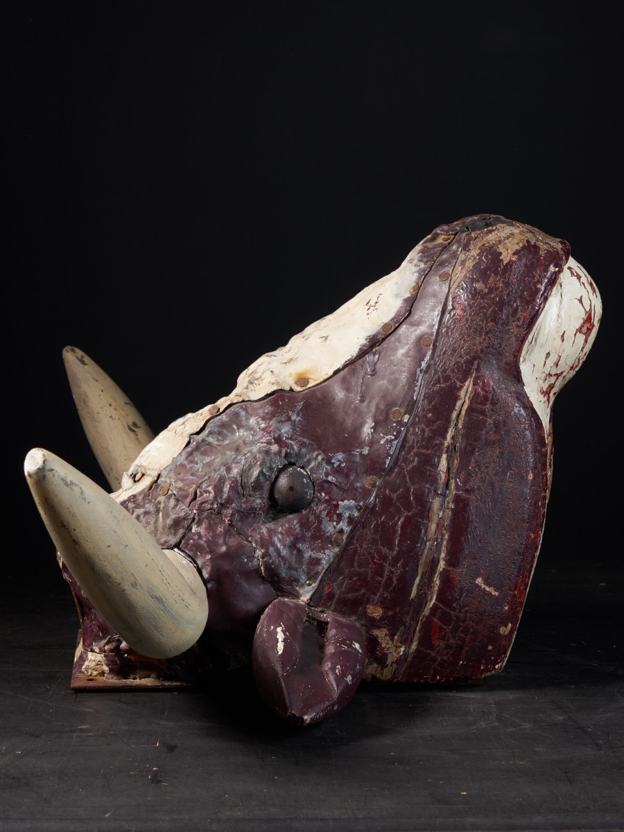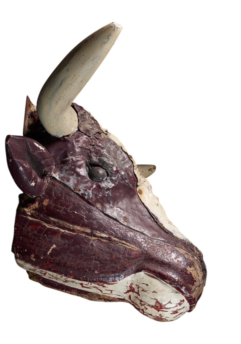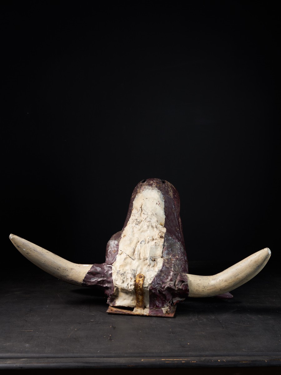 Antique French wooden steer's head, used as the exterior sign of a butcher’s shop (in French they would call it a Boucherie). The sign must be over a hundred years old, still has his original paint, a great patina, and nice age cracks. The horns, the underside of the chin, and the middle of the head are painted in ivory white and the rest of the bull's head is covered in a brown-reddish color. Considering its age, the external usage, and the fact that it survived two World Wars, it's in pretty good shape.