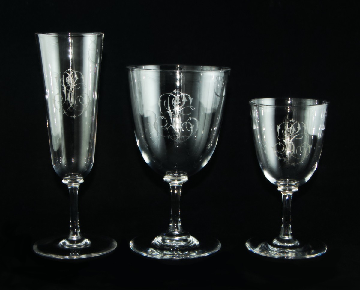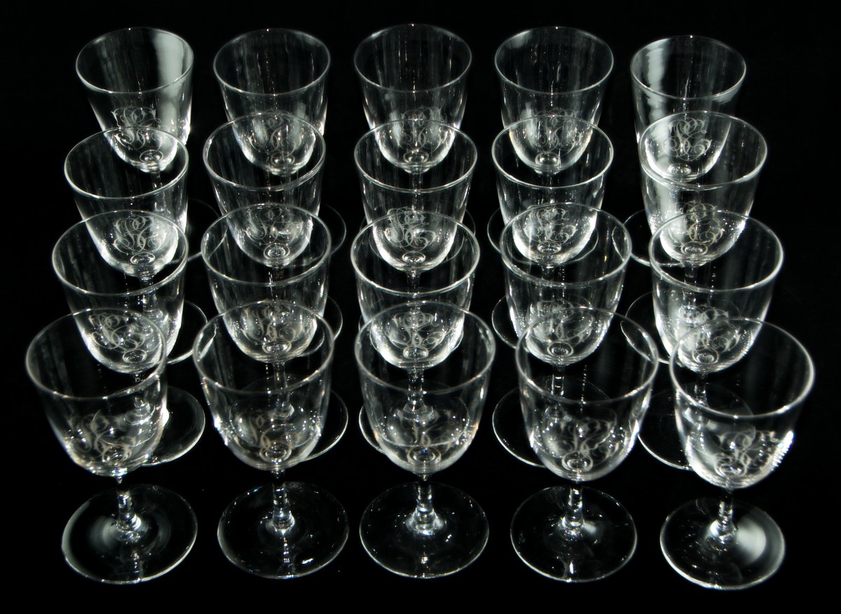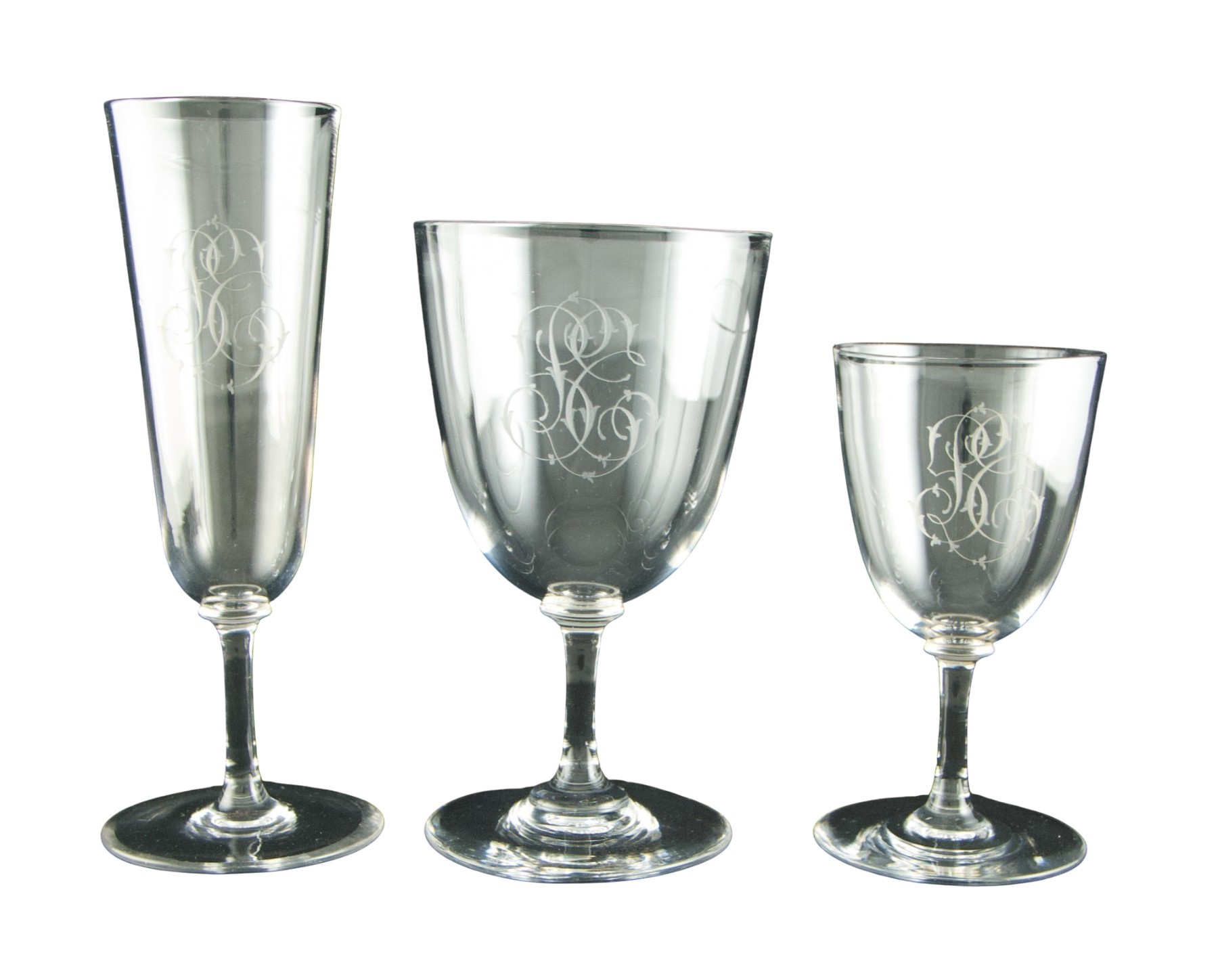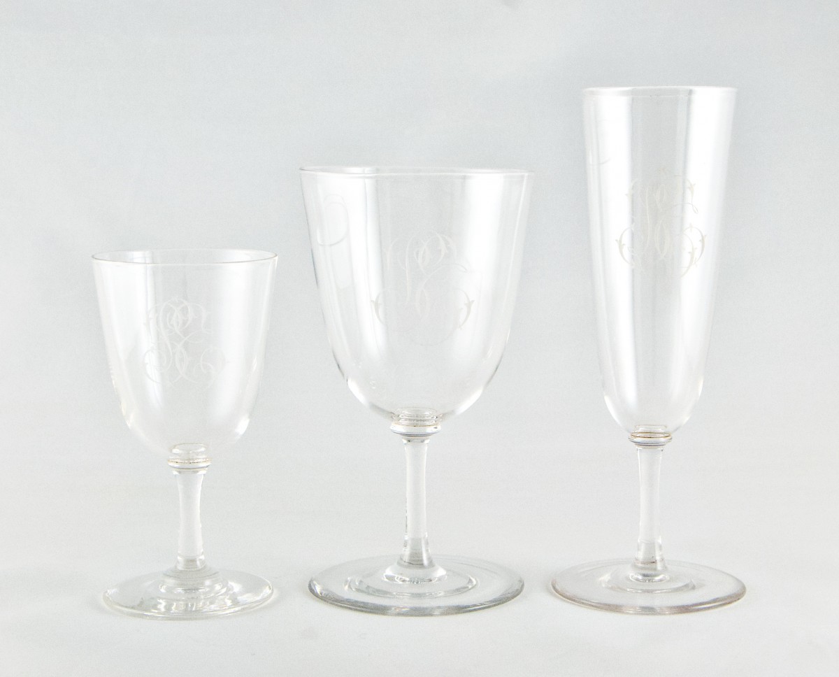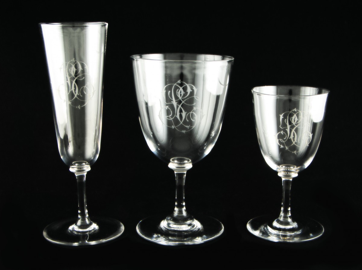 Set of forty-three clear crystal glasses in three sizes, with moulded stems and bowls finely engraved with an intertwined monogram in English script, composed of a central L flanked by the letters probably S and T.