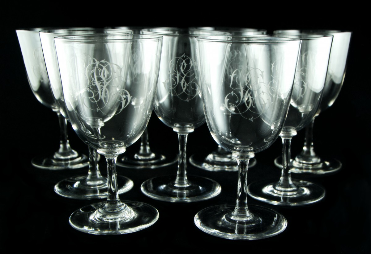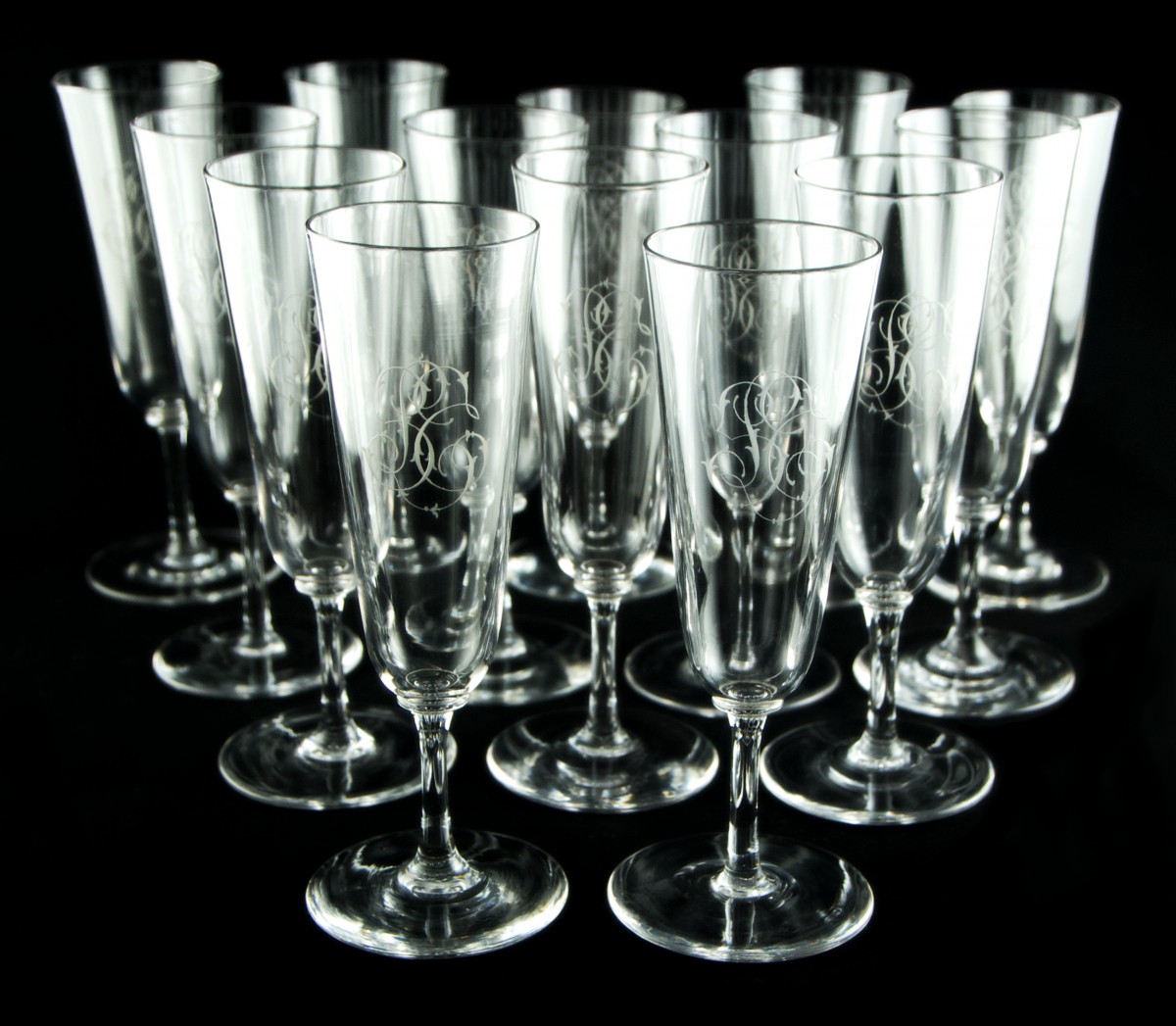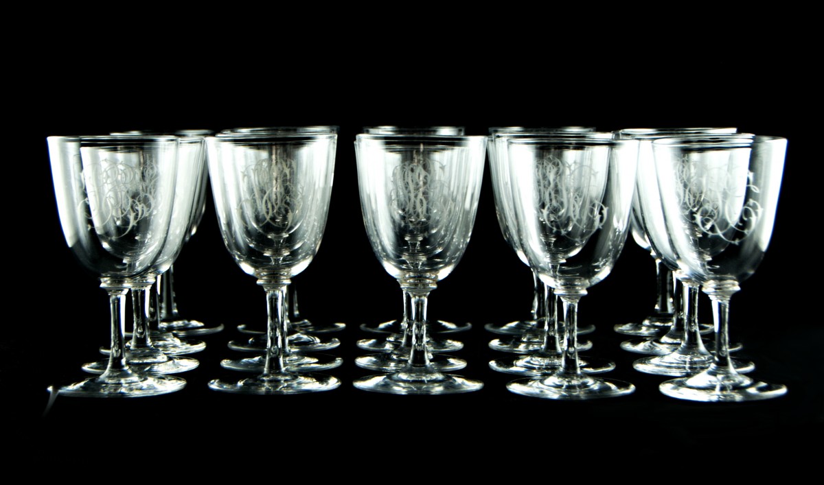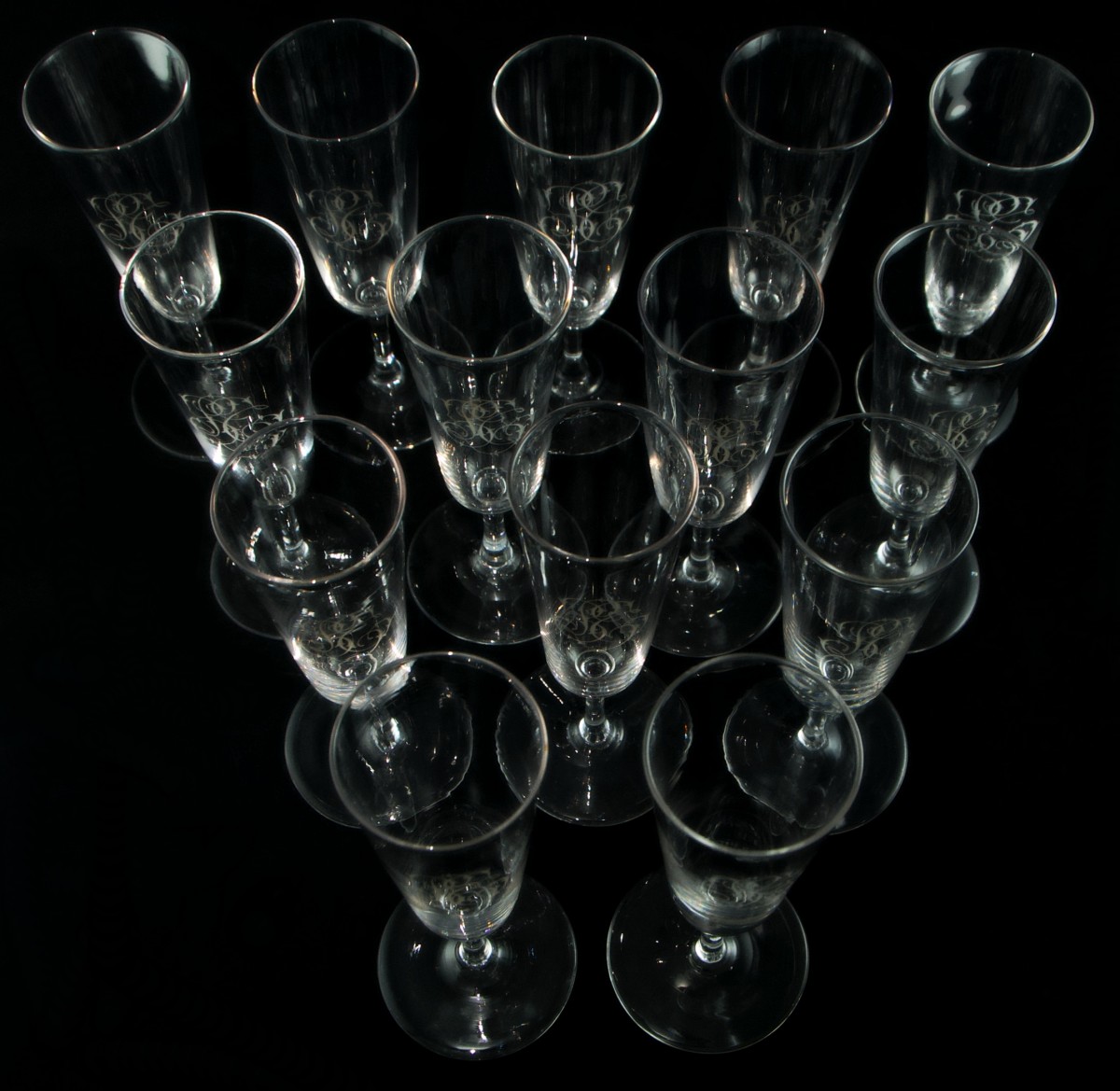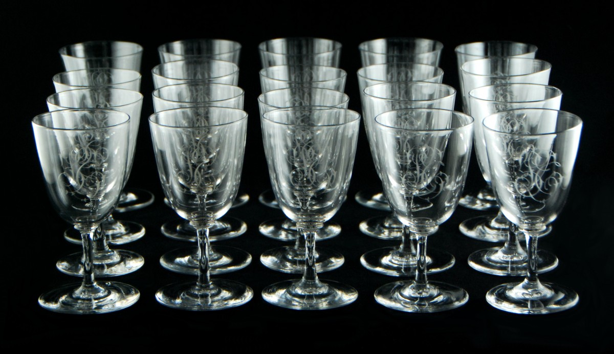 Set of forty-three clear crystal glasses in three sizes, with moulded stems and bowls finely engraved with an intertwined monogram in English script, composed of a central L flanked by the letters probably S and T.