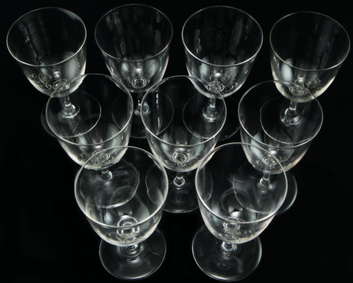• 9 water glasses – Height: 14.4 cm – Rim Ø: 7.8 cm – Foot Ø: 7.4 cm.