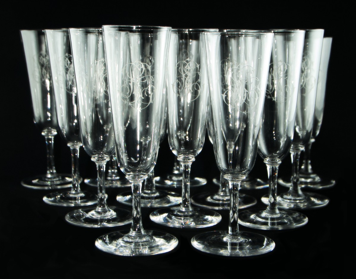 • 14 champagne glasses – Height: 16.8 cm – Rim Ø: 5.8 cm – Foot Ø: 6.5 cm.