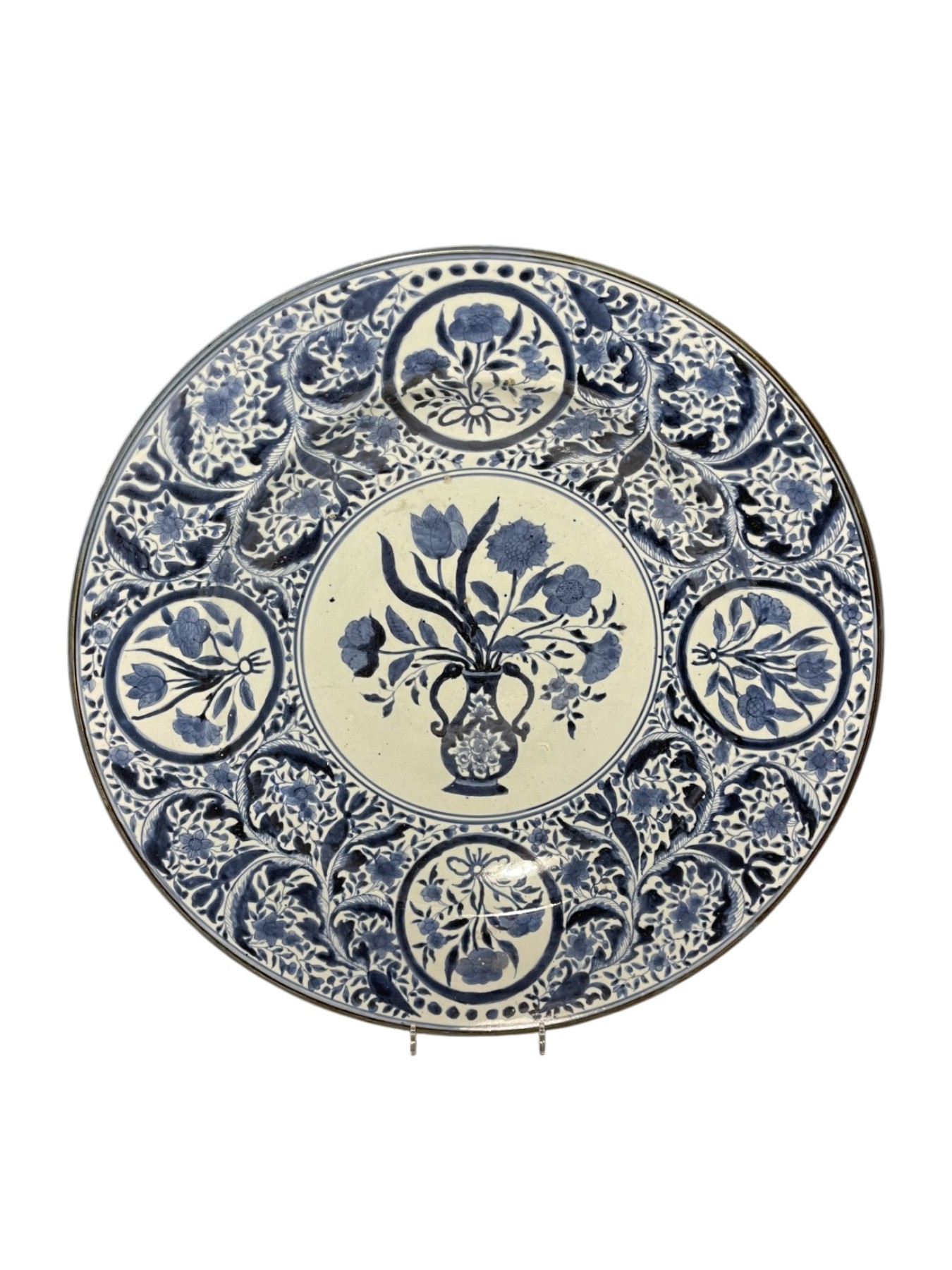 Rare large Japanese porcelain dish with blue Arita decoration of a flowery vase in the center and floral motifs in circular reserves on the border.