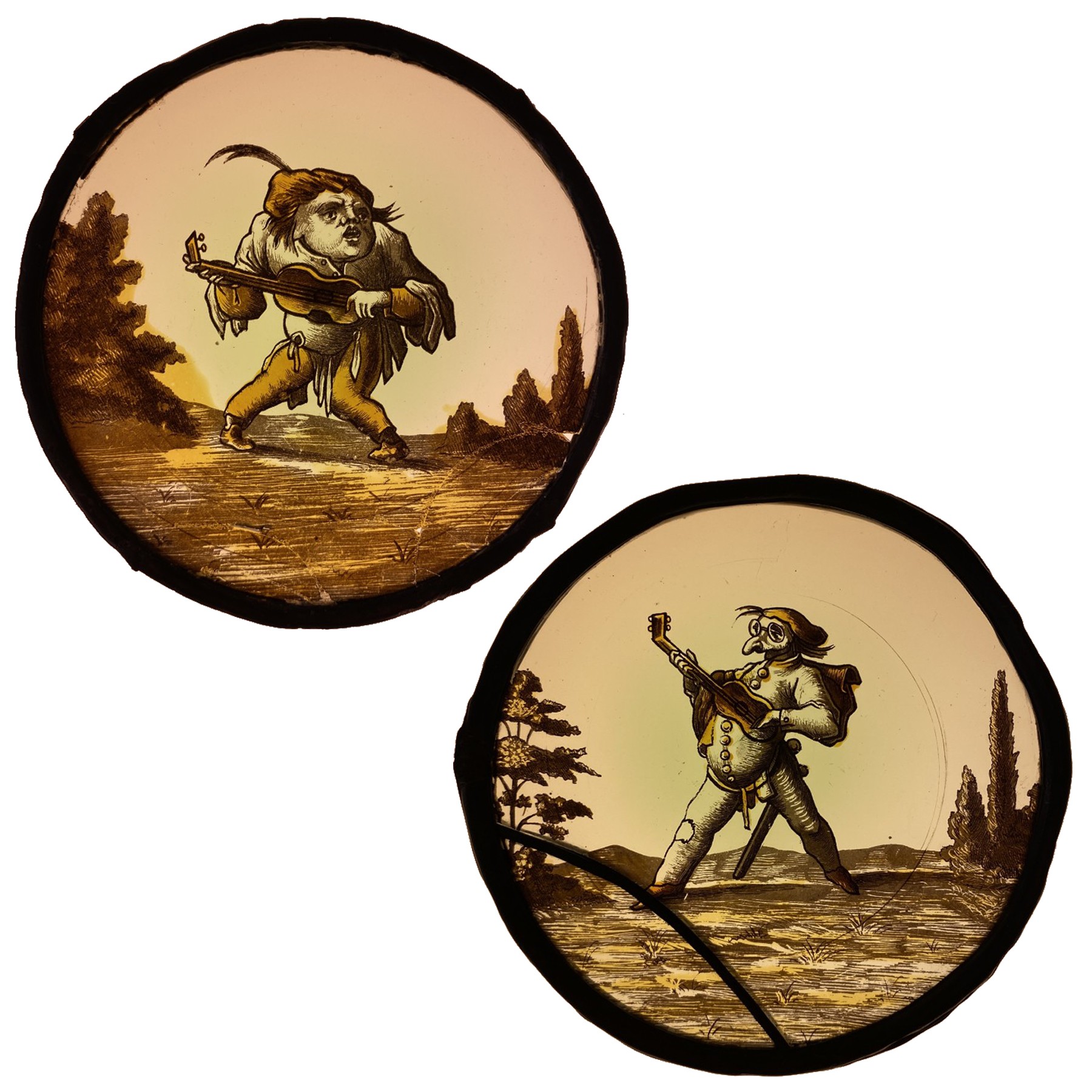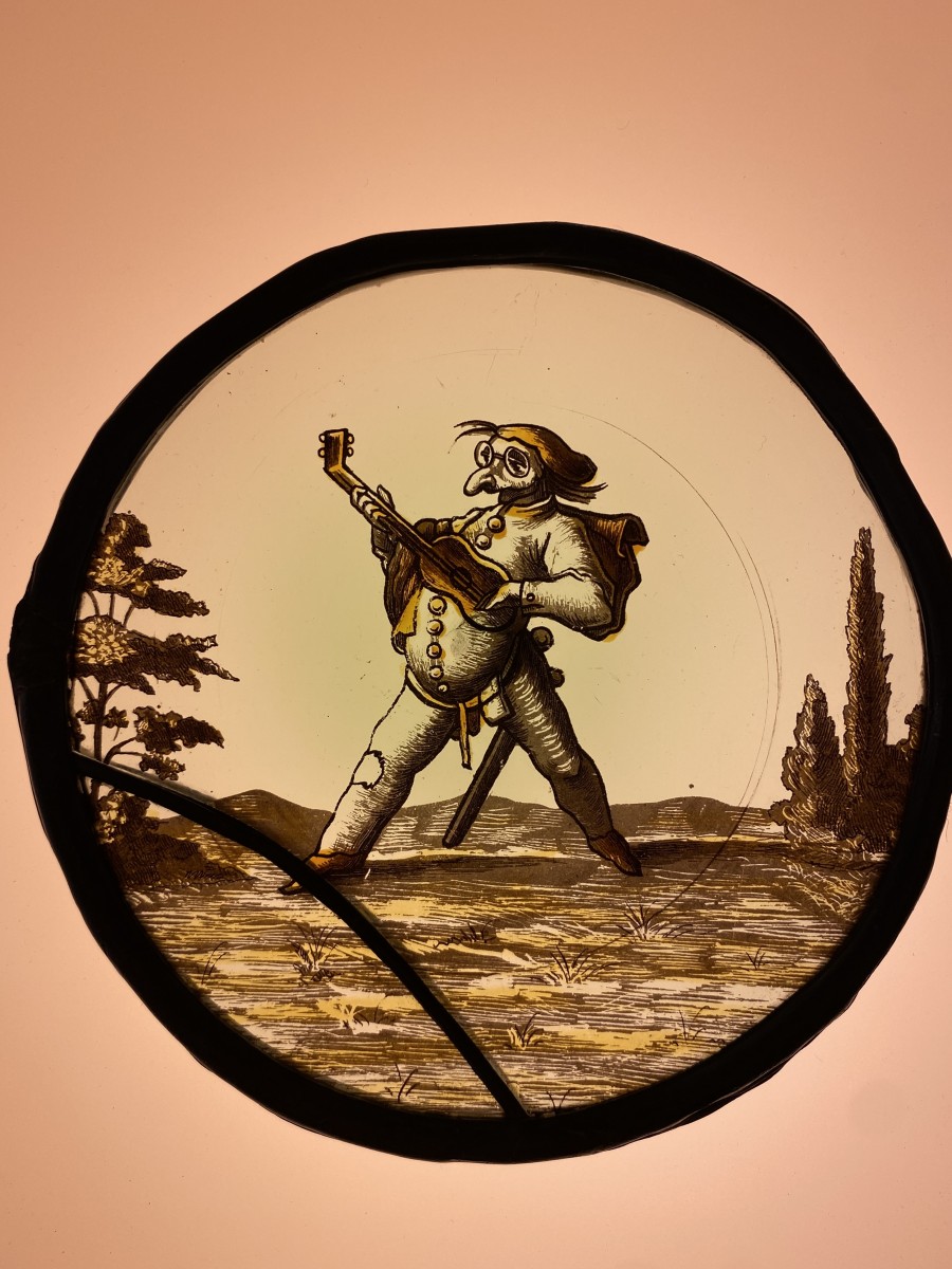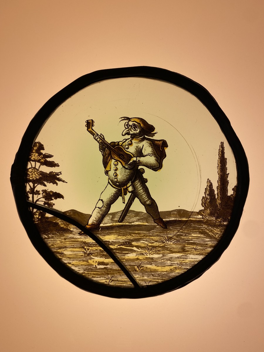 Two stained glass roundels with grotesque musicians from the commedia dell’arte. Irresistibly hilarious. One tall guitar player with what seems to be a mask with oversized nose and glasses. The other a more dwarflike well nourished musician. Somewhat like an early 17th century version of Laurel and Hardy in a heavy metal band. The original drawings are by Jacques Callot (1592-1635). Grisaille and silver stain. Condition: one has a lead repaired crack and the other four restored cracks in the lower part (under the feet) of the glass.
