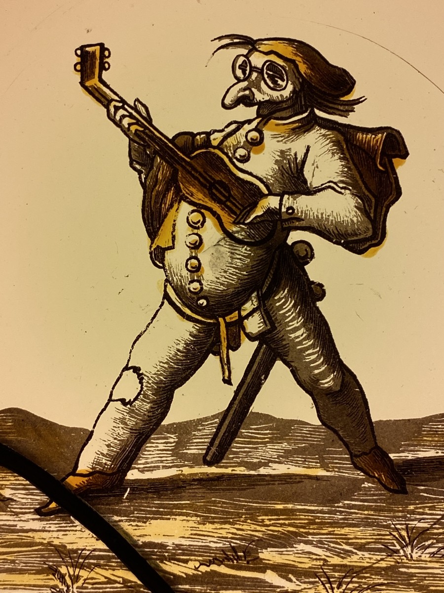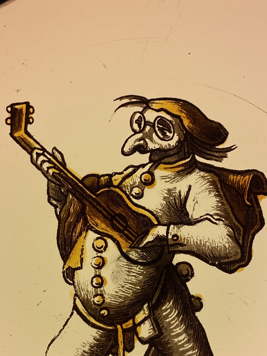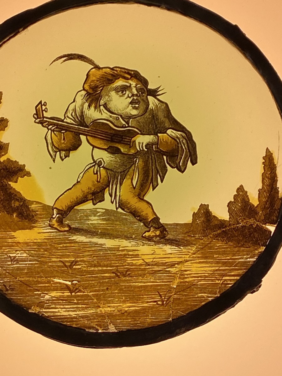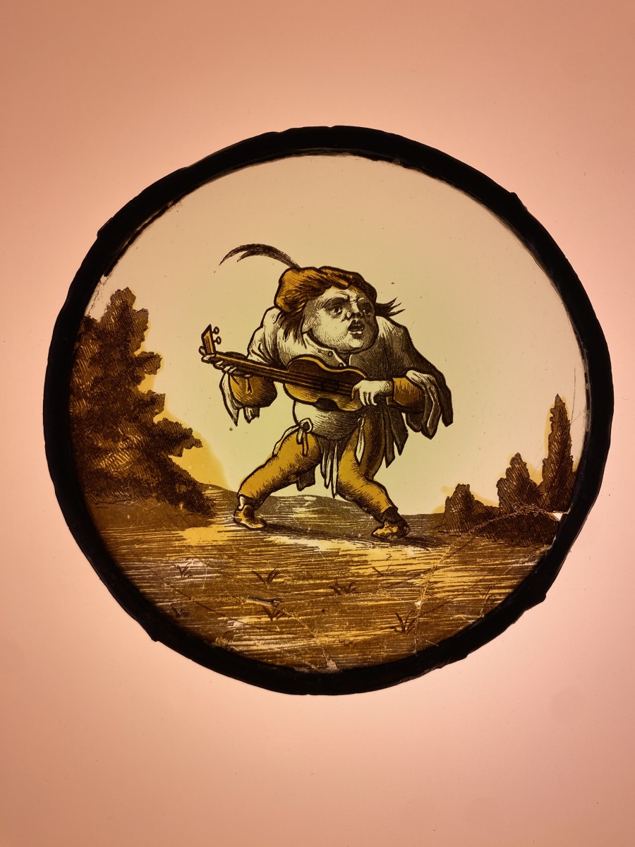 Two stained glass roundels with grotesque musicians from the commedia dell’arte. Irresistibly hilarious. One tall guitar player with what seems to be a mask with oversized nose and glasses. The other a more dwarflike well nourished musician. Somewhat like an early 17th century version of Laurel and Hardy in a heavy metal band. The original drawings are by Jacques Callot (1592-1635). Grisaille and silver stain. Condition: one has a lead repaired crack and the other four restored cracks in the lower part (under the feet) of the glass.