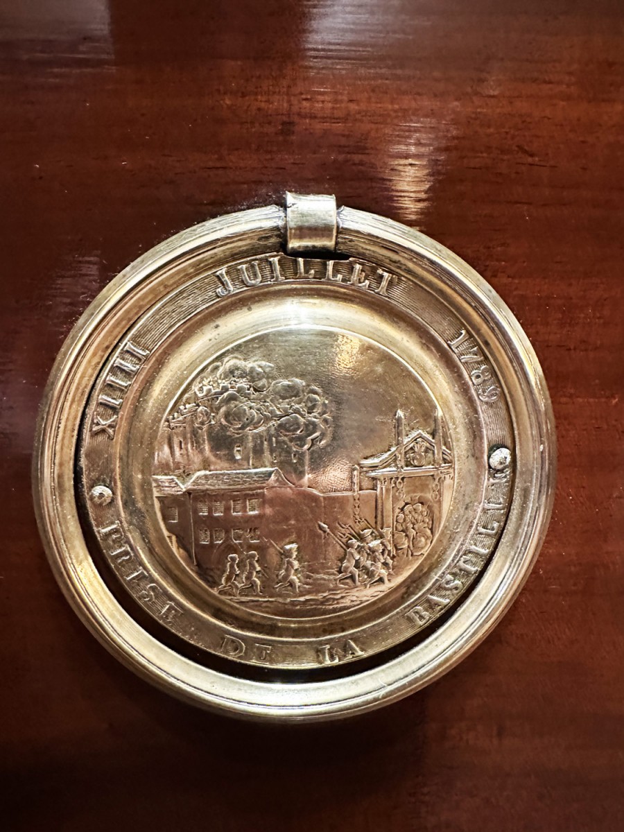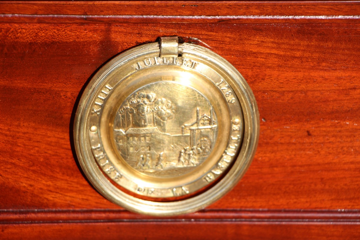 A Louis XVI period commode in mahogany and mahogany veneer on an oak frame. It features three drawers in three rows, each with rare stamped brass mounts depicting the revolutionary storming of the Bastille. The rounded, fluted uprights and the top are of polished white marble, possibly later. H. 82.5cm - W. 97cm - D. 48cm. In very good original condition. Condition report and technical photographs available upon request.