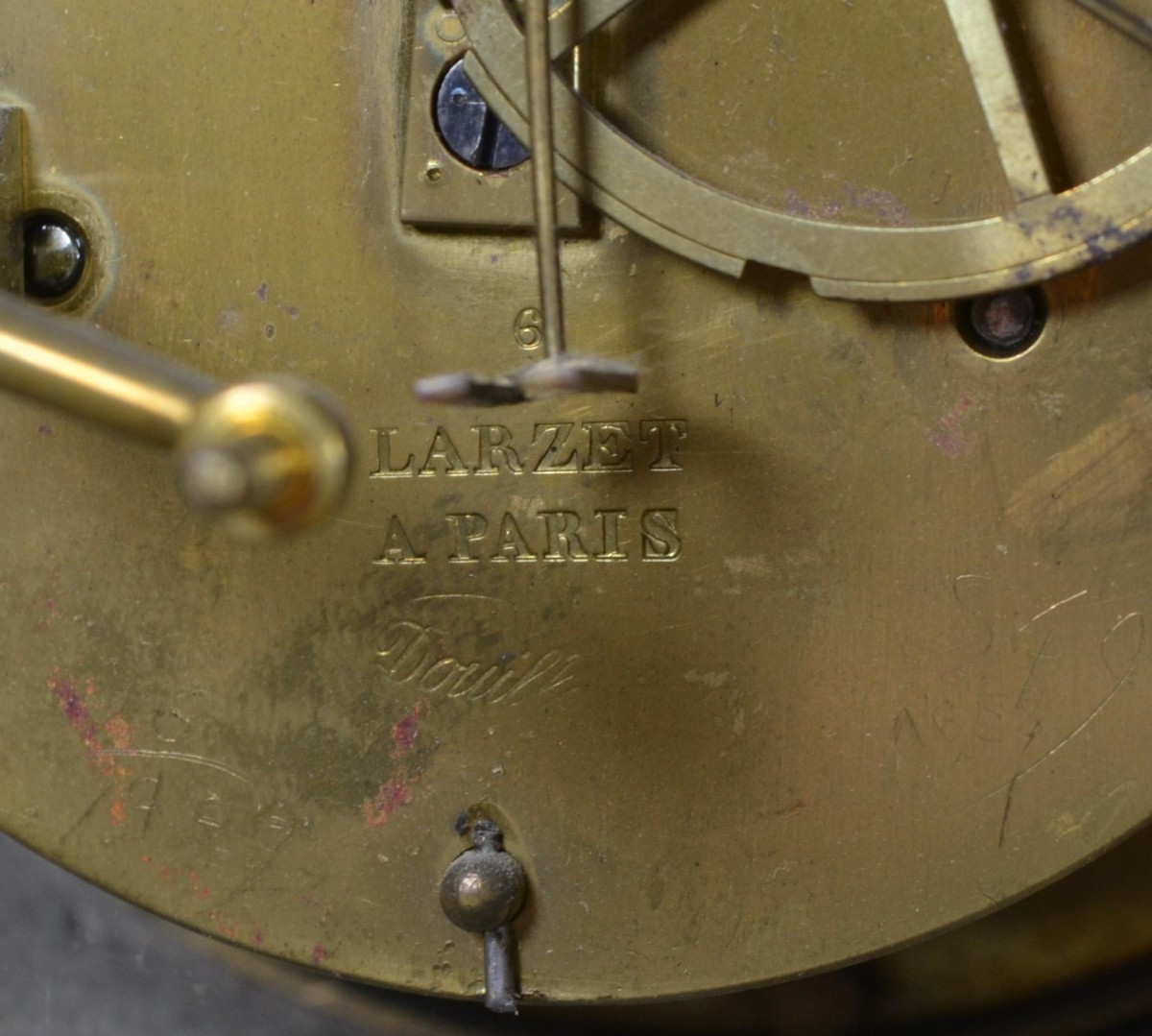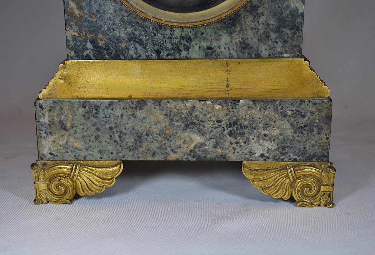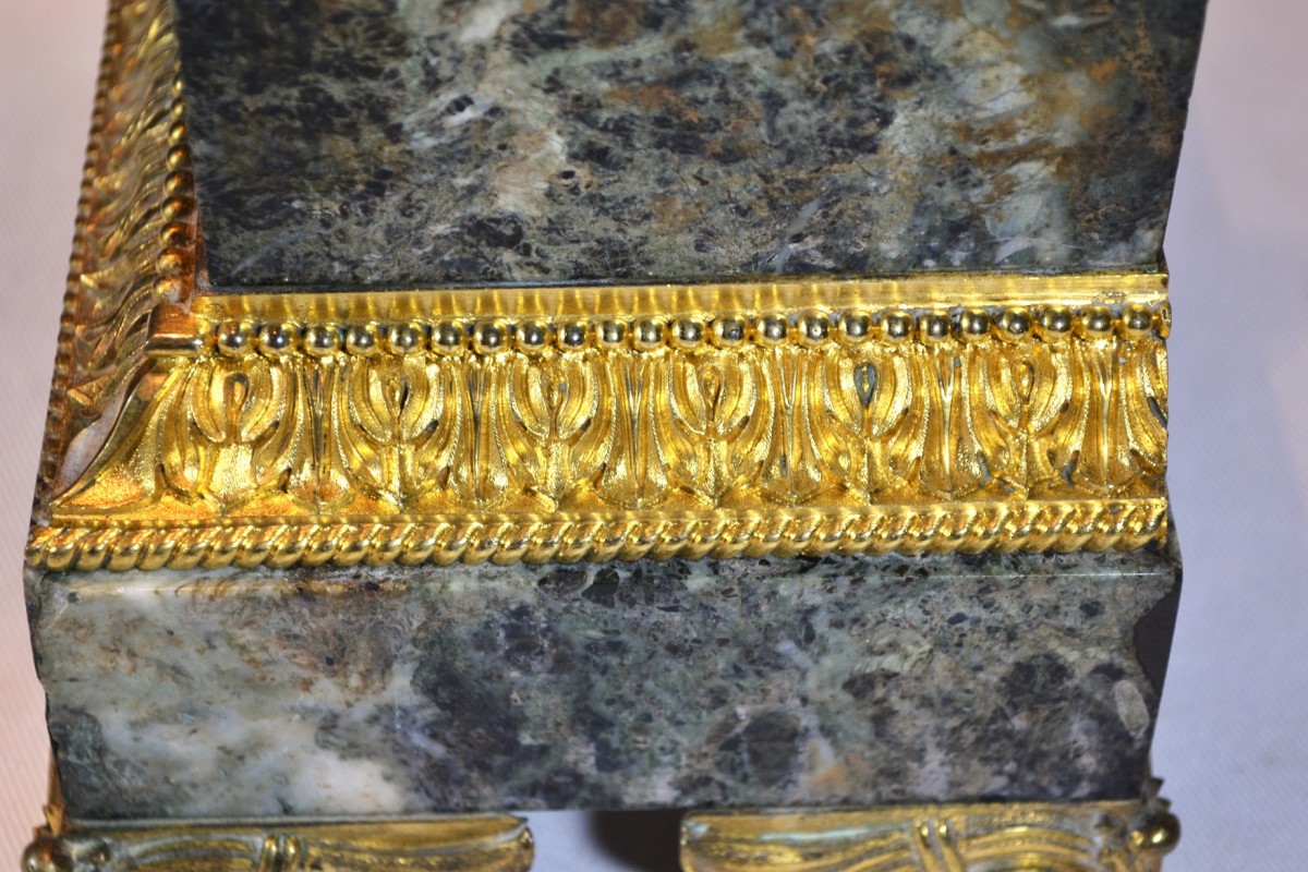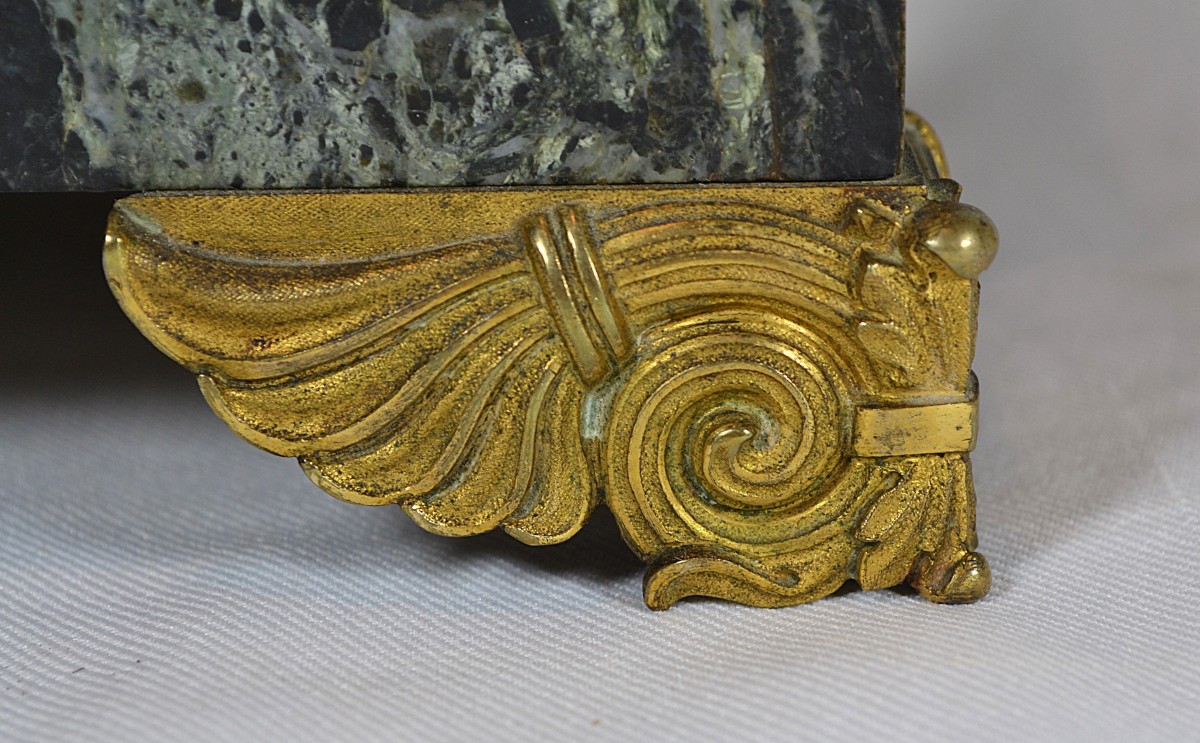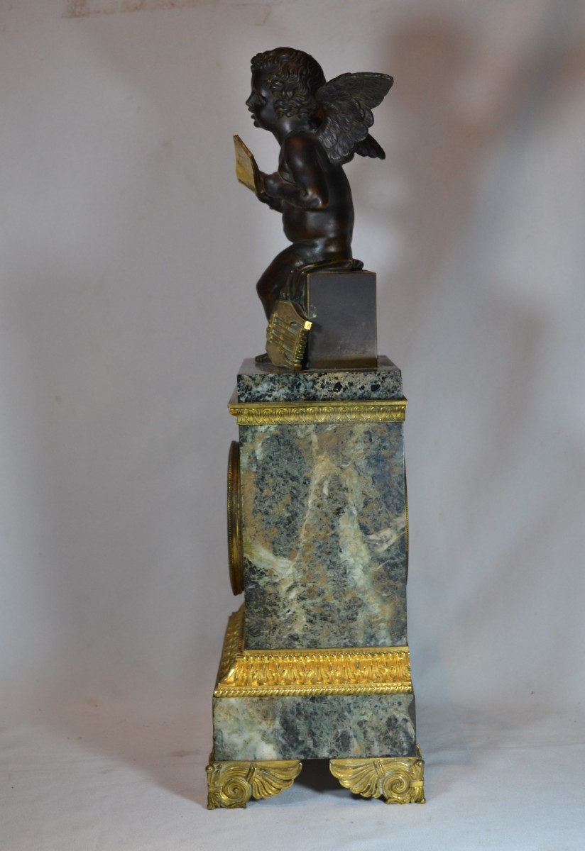 A late Empire style mantel clock in green marble and patinated bronze, with gilt bronze details. The dial is signed "Chaudé, clockmaker to the king." On the back of the movement is stamped the mark "Larzet à Paris" with, below it, the signature "Douille" discreetly engraved. The movement has a silk thread winding mechanism. The striking mechanism marks the hours and half-hours. In good working order. The entire clock is made of green veined marble; at the top, a putto in patinated brown bronze consults a book, with a lyre at his feet. The putto statuette is remarkable. The other bronze parts are gilded and finely chased; it is exceptional to encounter a piece of such excellence. For its creation, Chaudé called upon the best artist of his time. The fact that he added "Clockmaker to the King" to his name proves that we are after 1815, during the Restoration period, and at that time only Thomire could produce bronzes of this optimal quality. Fine scratches on the twisted gilt bronze cord were chased to simulate plant fibers, which softens the cord's brilliance. We did not disassemble the clock to check if any bronze element bore a workshop mark. As the Empire style is still very pronounced, we can suggest a date of creation around 1815-20. This is an exceptional piece.