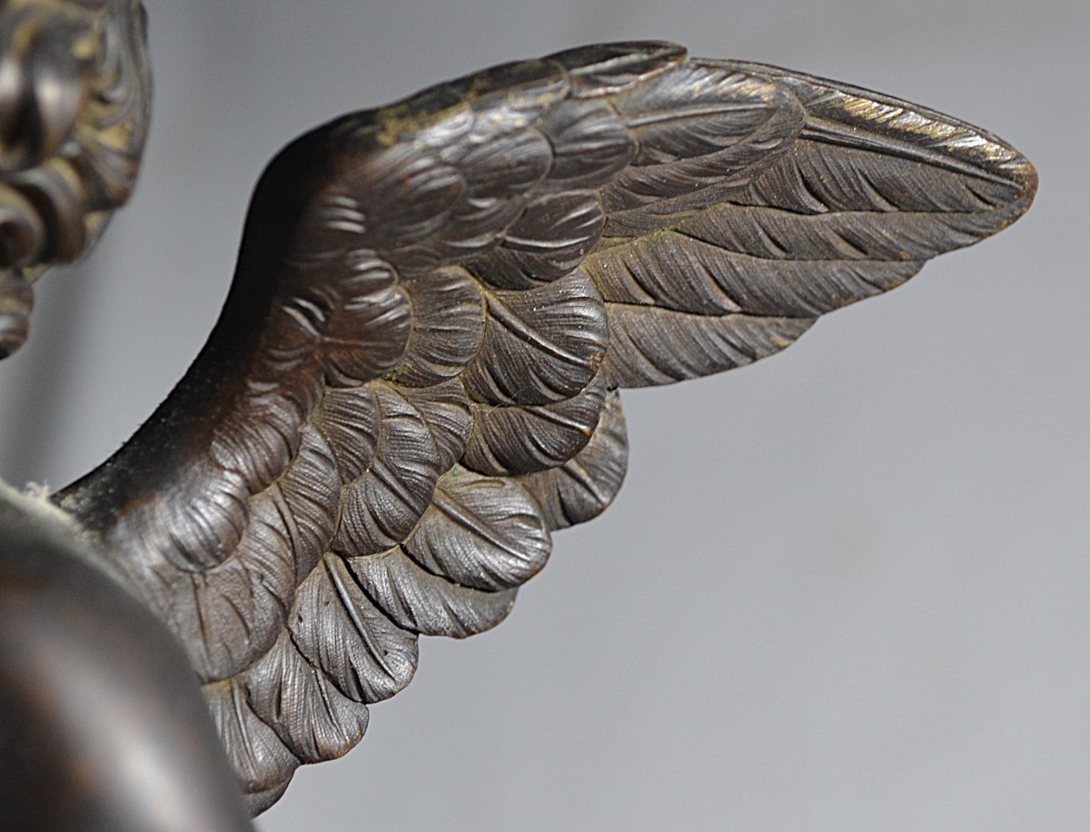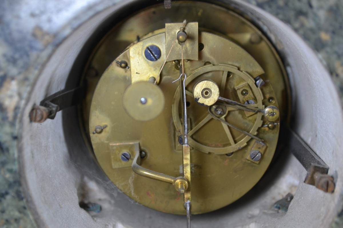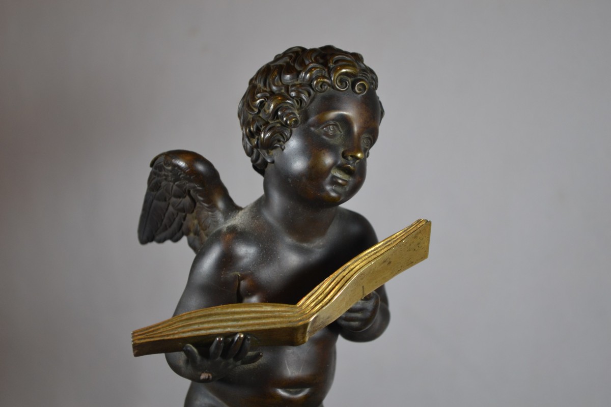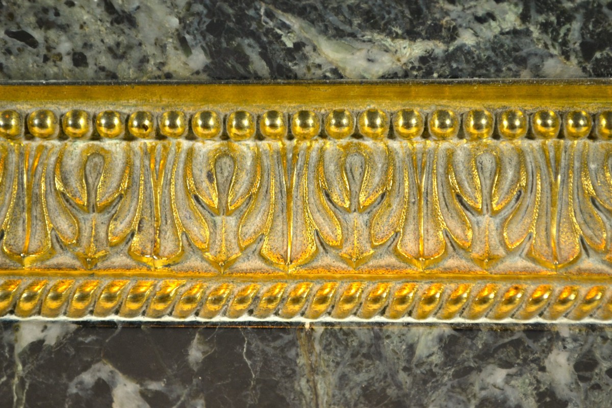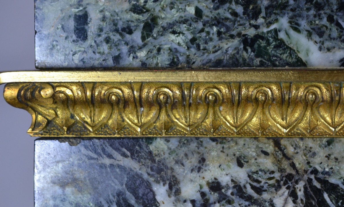 A late Empire style mantel clock in green marble and patinated bronze, with gilt bronze details. The dial is signed "Chaudé, clockmaker to the king." On the back of the movement is stamped the mark "Larzet à Paris" with, below it, the signature "Douille" discreetly engraved. The movement has a silk thread winding mechanism. The striking mechanism marks the hours and half-hours. In good working order. The entire clock is made of green veined marble; at the top, a putto in patinated brown bronze consults a book, with a lyre at his feet. The putto statuette is remarkable. The other bronze parts are gilded and finely chased; it is exceptional to encounter a piece of such excellence. For its creation, Chaudé called upon the best artist of his time. The fact that he added "Clockmaker to the King" to his name proves that we are after 1815, during the Restoration period, and at that time only Thomire could produce bronzes of this optimal quality. Fine scratches on the twisted gilt bronze cord were chased to simulate plant fibers, which softens the cord's brilliance. We did not disassemble the clock to check if any bronze element bore a workshop mark. As the Empire style is still very pronounced, we can suggest a date of creation around 1815-20. This is an exceptional piece.