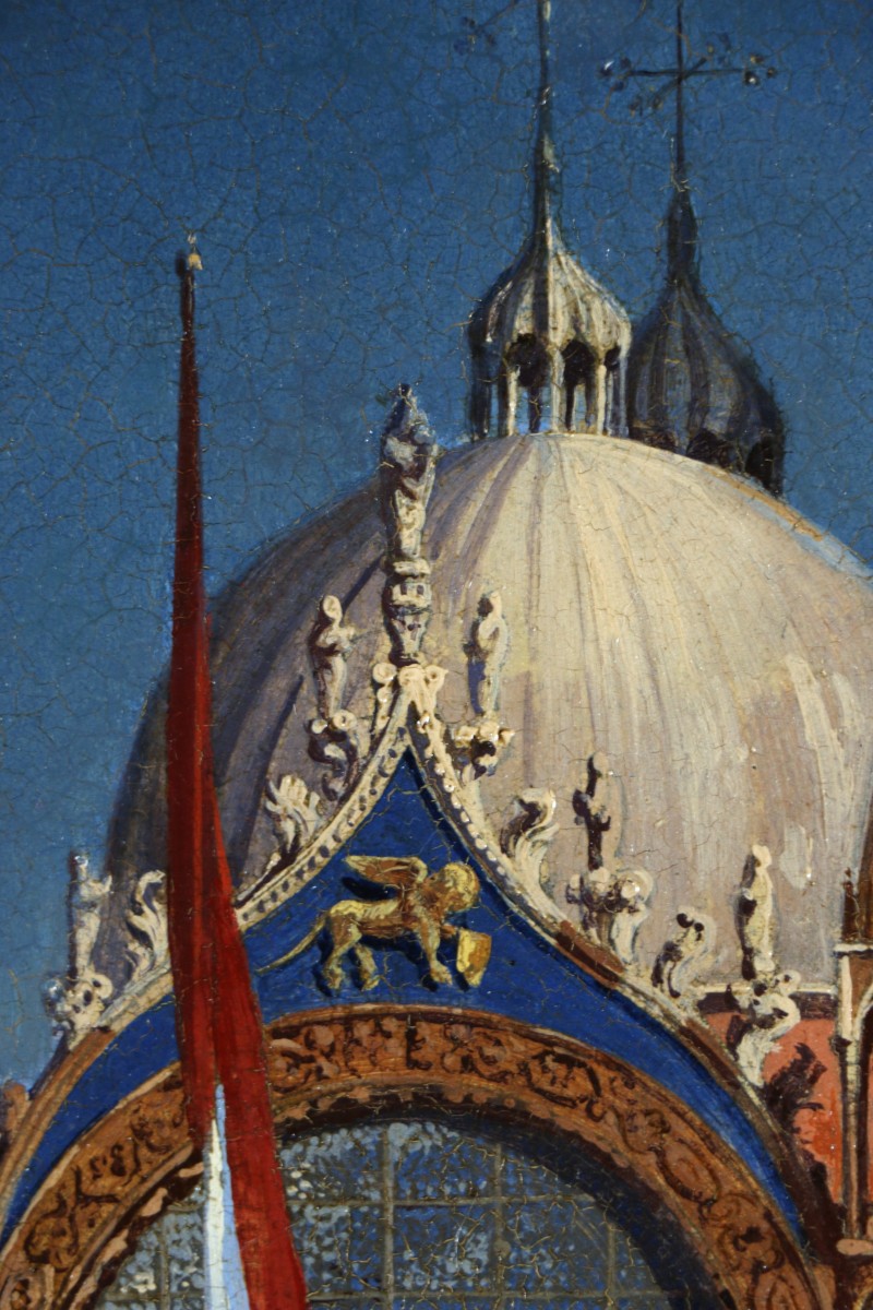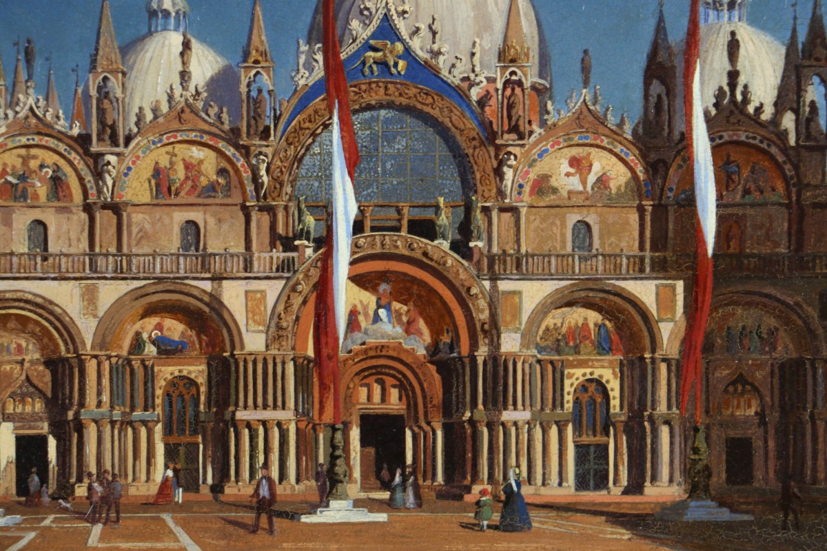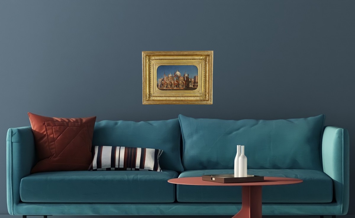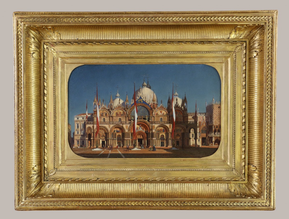 This superb painting, beautifully framed, depicts the Basilica of Saint Mark bathed in the low sun of late afternoon, creating a striking effect with warm, contrasting tones. The artist clearly cherished this time of day, as he produced many works using a similar palette between 1858—when he returned to Venice—and his death in 1866.