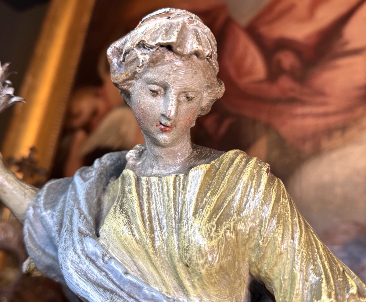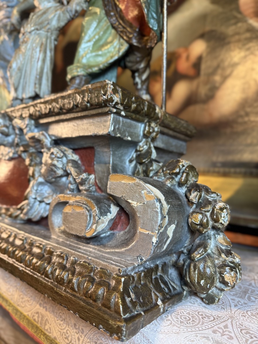 An 18th-century Flemish polychrome wooden sculpture of the Holy Family. Our Holy Family, like an "earthly" reflection of the Holy Trinity, appears to be in motion, with sweeping gestures reminiscent of the Mannerist style. They rest on a richly ornamented base decorated with Baroque scrollwork. At the center, a red cartouche is surrounded by three cherub heads and foliate motifs carved in relief.