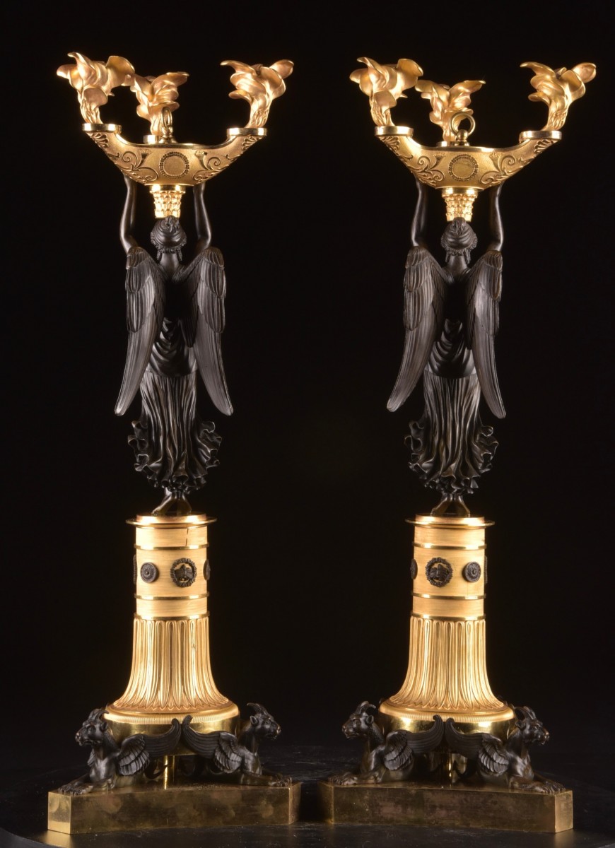 Pair of exceptionally fine patinated and fire-gilt bronze candelabra, attributed to Pierre-Philippe Thomire (1751–1843), the pre-eminent bronzier of the French Empire period. The superb sculptural modelling, the precision of the chasing and the perfectly balanced proportions firmly situate this ensemble within the refined production of Thomire’s atelier.