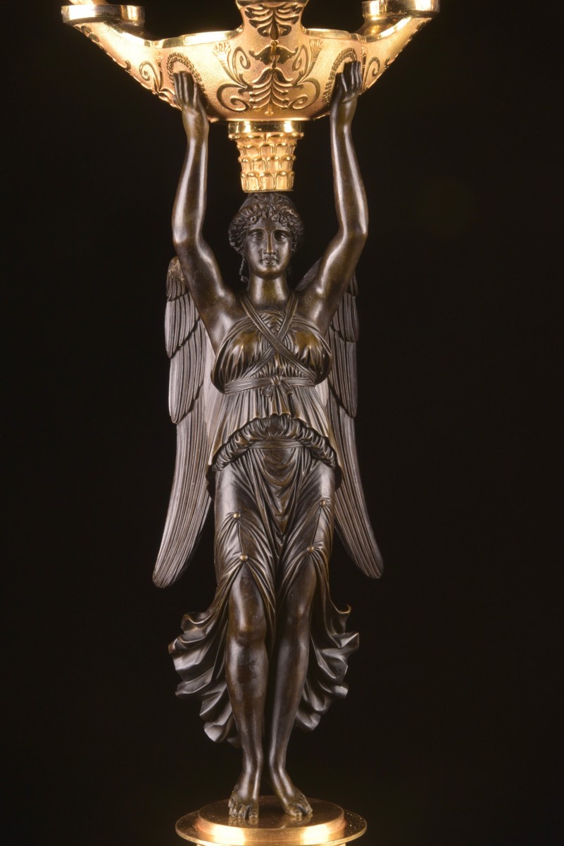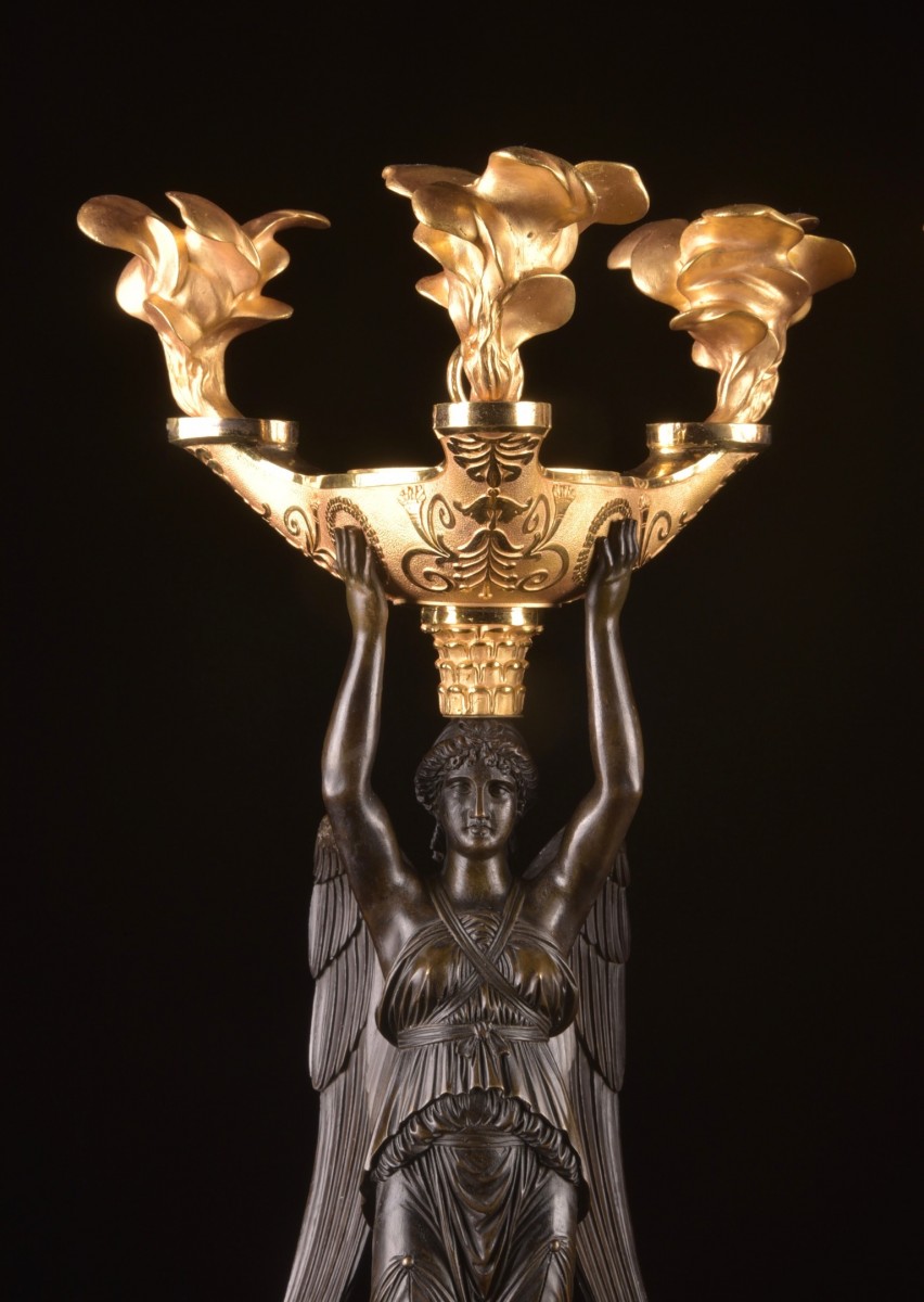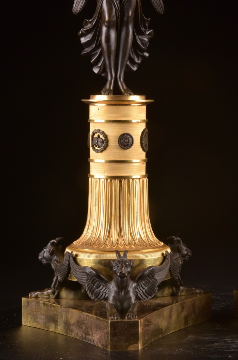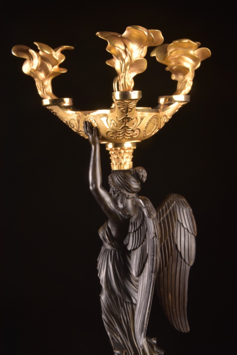 Each candelabrum is carried by a winged Victory figure in dark patinated bronze, masterfully modelled with grace and fluidity. The raised arms support a richly ornamented lamp-shaped bowl, from which emerge flame-like gilt branches — a luxurious motif closely associated with some of Thomire’s most celebrated works.