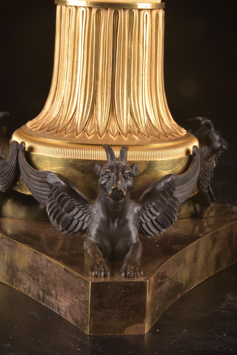 The finely engine-turned cylindrical drum with applied patinated medallions rests on an elegant fluted base in ormolu. Four mythological sphinxes anchor the stepped plinth, reinforcing the architectural presence typical of Empire design. The technical execution and artistic harmony elevate this pair to the highest level of early 19th-century French bronze craftsmanship.