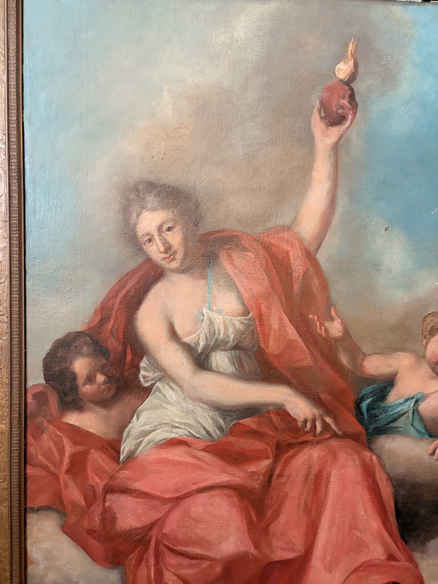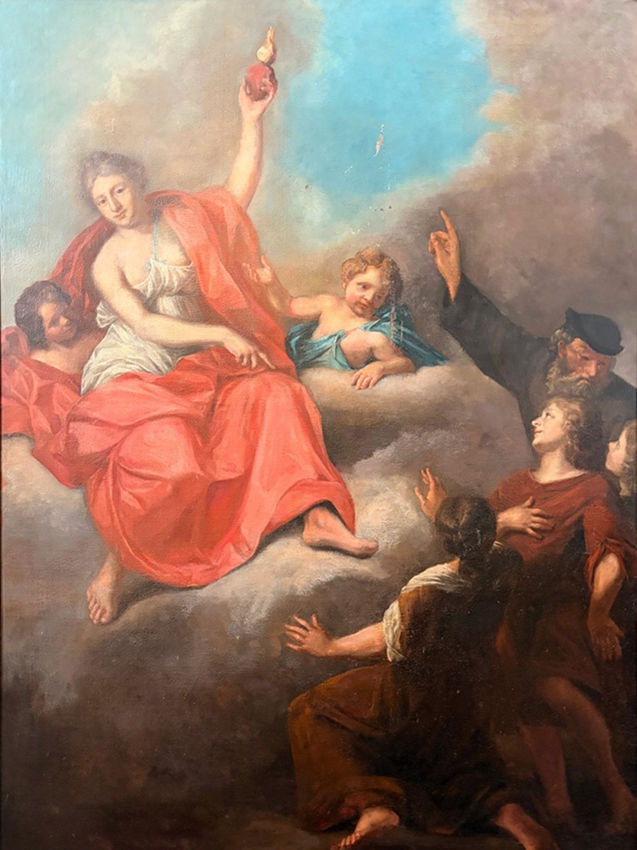 A striking allegorical masterpiece from the early 18th century, depicting Venus — goddess of love and desire — raising a flaming heart as a powerful symbol of passion and devotion. Surrounded by cupids and admiring figures, the composition unfolds with theatrical elegance, emotional intensity, and refined grace.