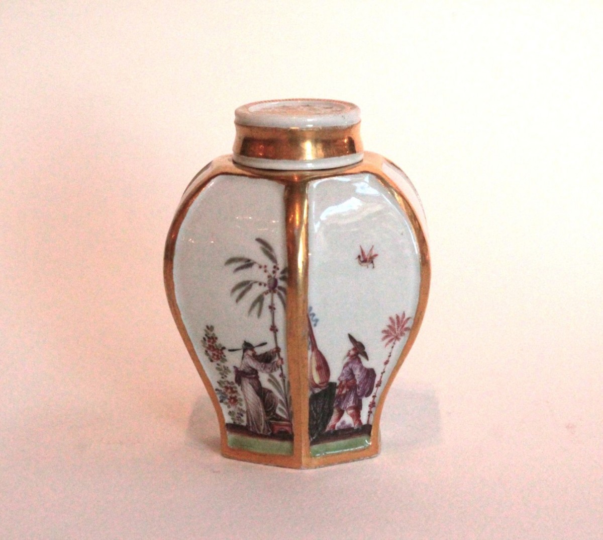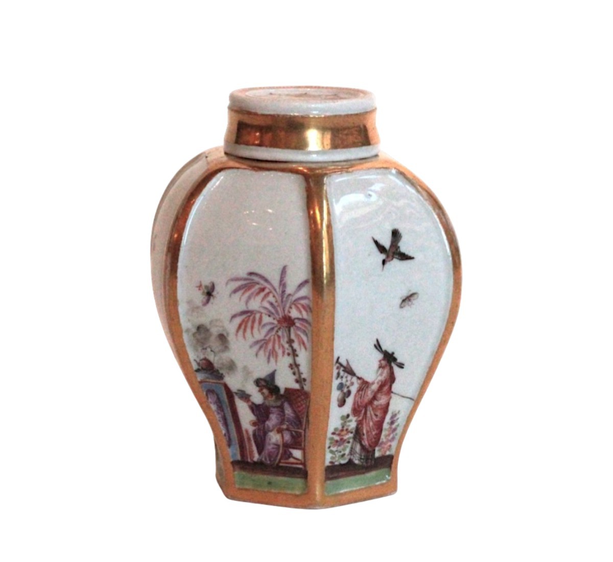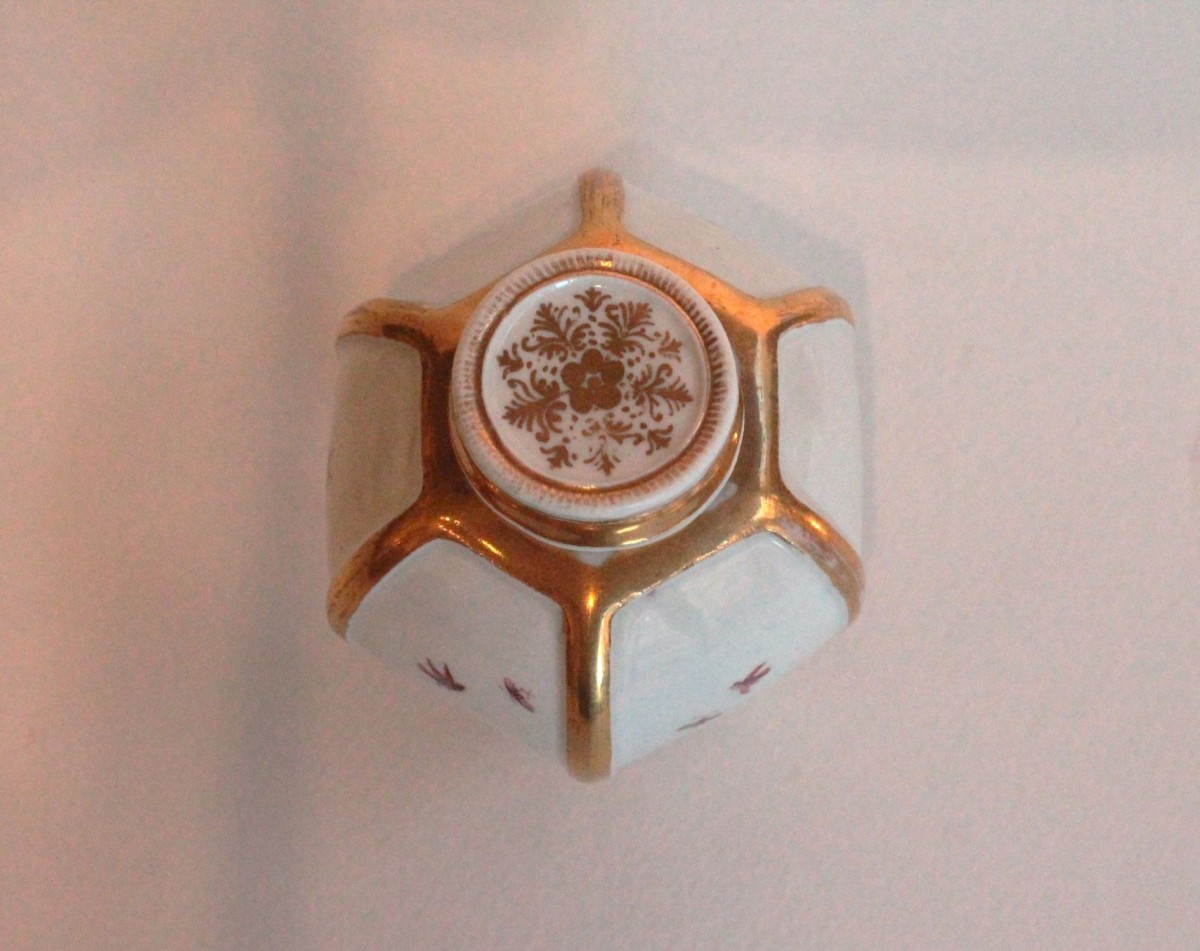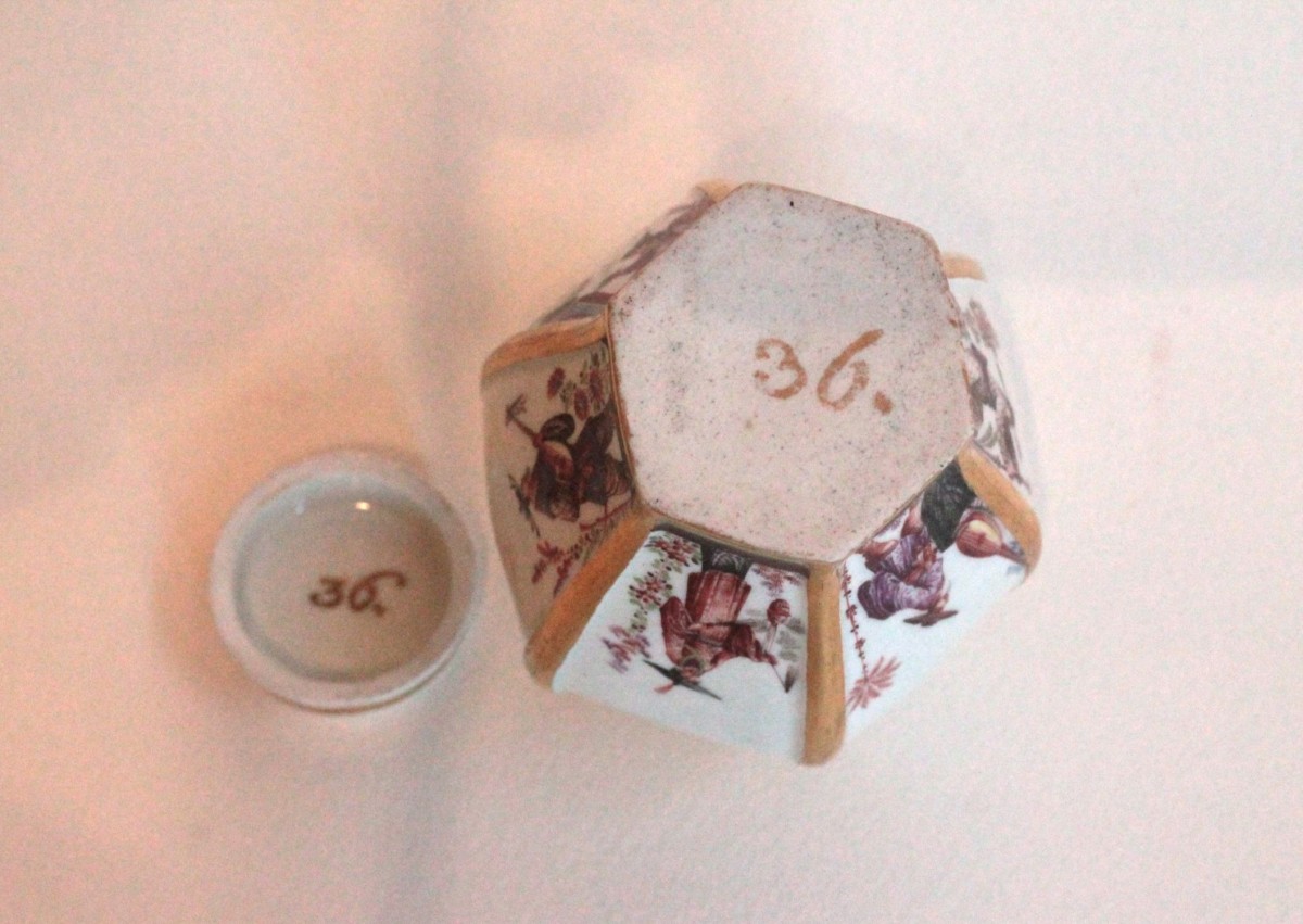 Hexagonal tea caddy with lid, made of Meissen porcelain with polychrome Chinese decoration on terraces, in compartments framed with gold fillets, in the style of Hörold. The lid is decorated with a gold rosette. The base and lid are marked with the number 36 in gold. Circa 1725-30, 18th century. H. 10.5 cm.
