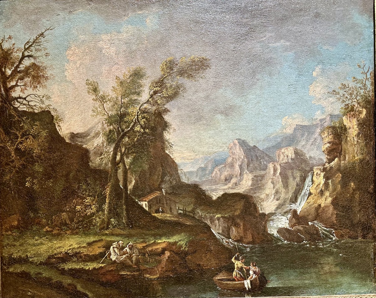 Landscape with Waterfall by Alessandro Magnasco (1667–1749). Circle. Our painting reflects the landscape style specific to Alessandro Magnasco, featuring dramatic, steep mountains, gnarled trees, and isolated figures within a vast landscape, creating a wild and romantic atmosphere. It belongs to the tradition of Italian landscape painting from the Genoese school of the late 17th and early 18th centuries. Oil on canvas; Dimensions: with frame, width 62 cm, height 52 cm. Without frame, width 47 cm, height 38 cm.