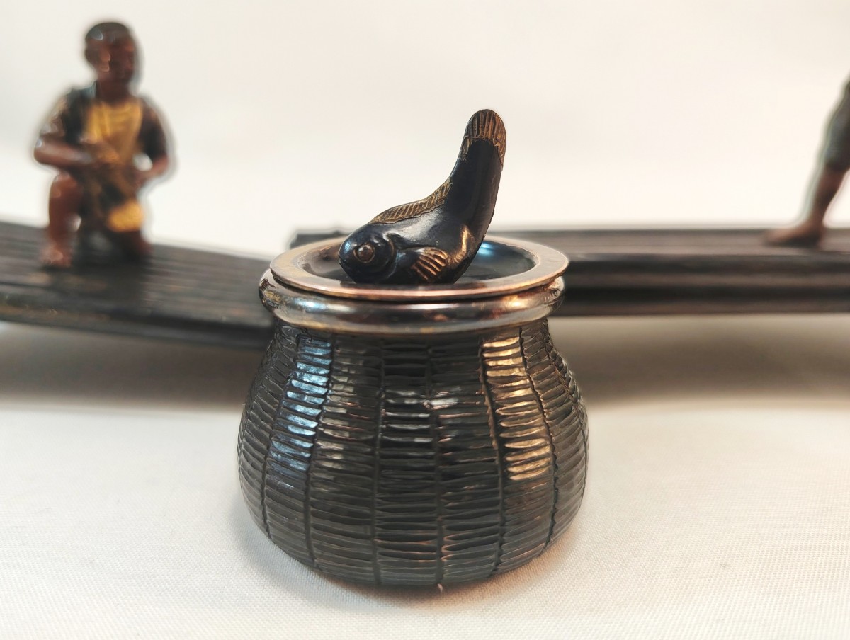A basket beside them, containing a fish, serves as an inkwell (the glass is missing).