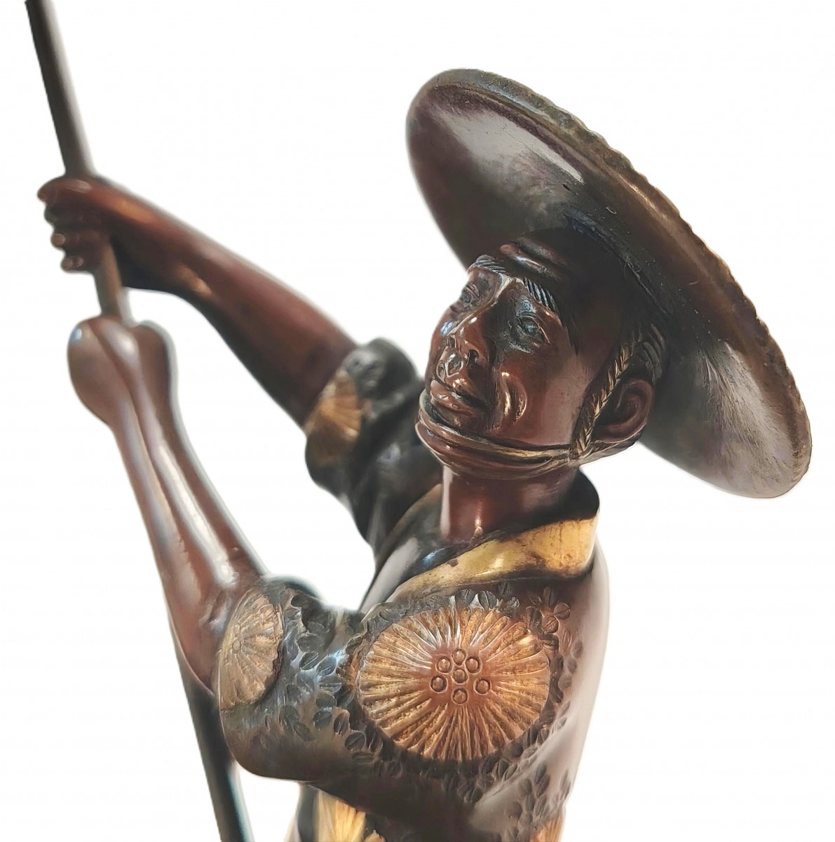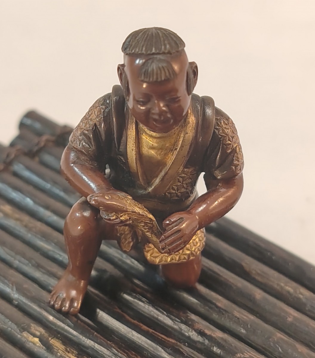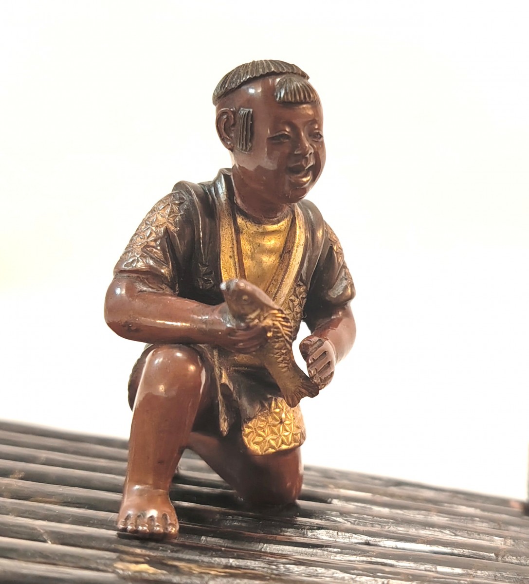 Beautifully crafted patinated and gilded bronze, finely chased, reminiscent of the work of Miyao Eisuke's workshops.
