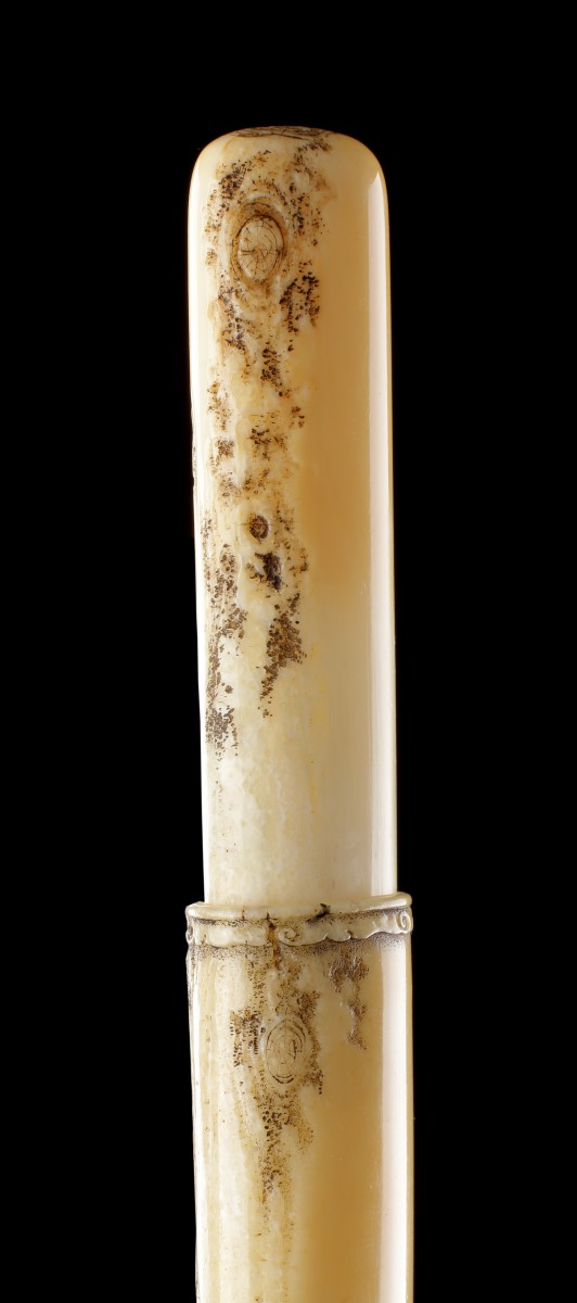 Carved from a single walrus tusk, with Jo standing at the base of a large pine tree, a branch of which forms the cord attachment
