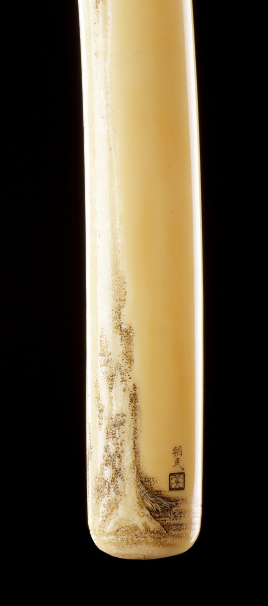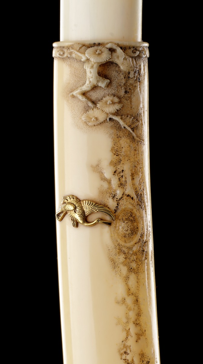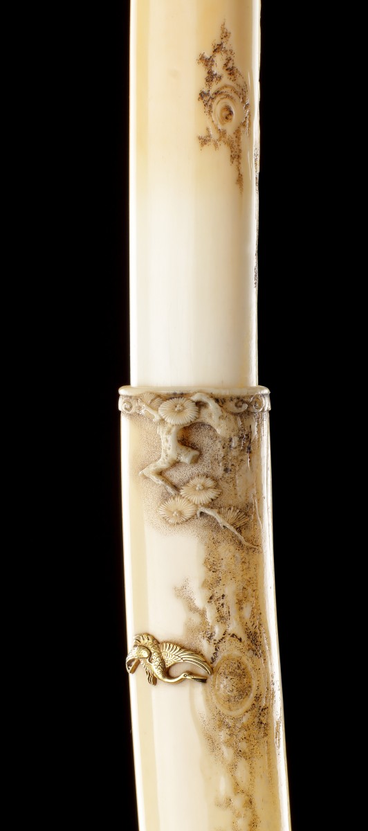 The artist has ingeniously employed the vertical ‘crystal’ grain of the tusk to replicate the texture of the tree bark.
