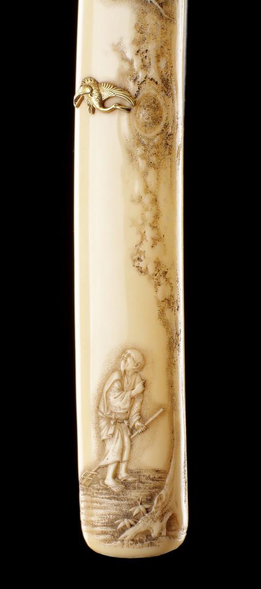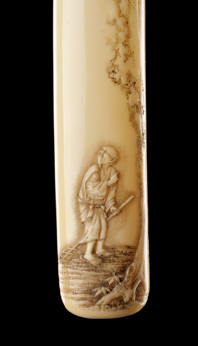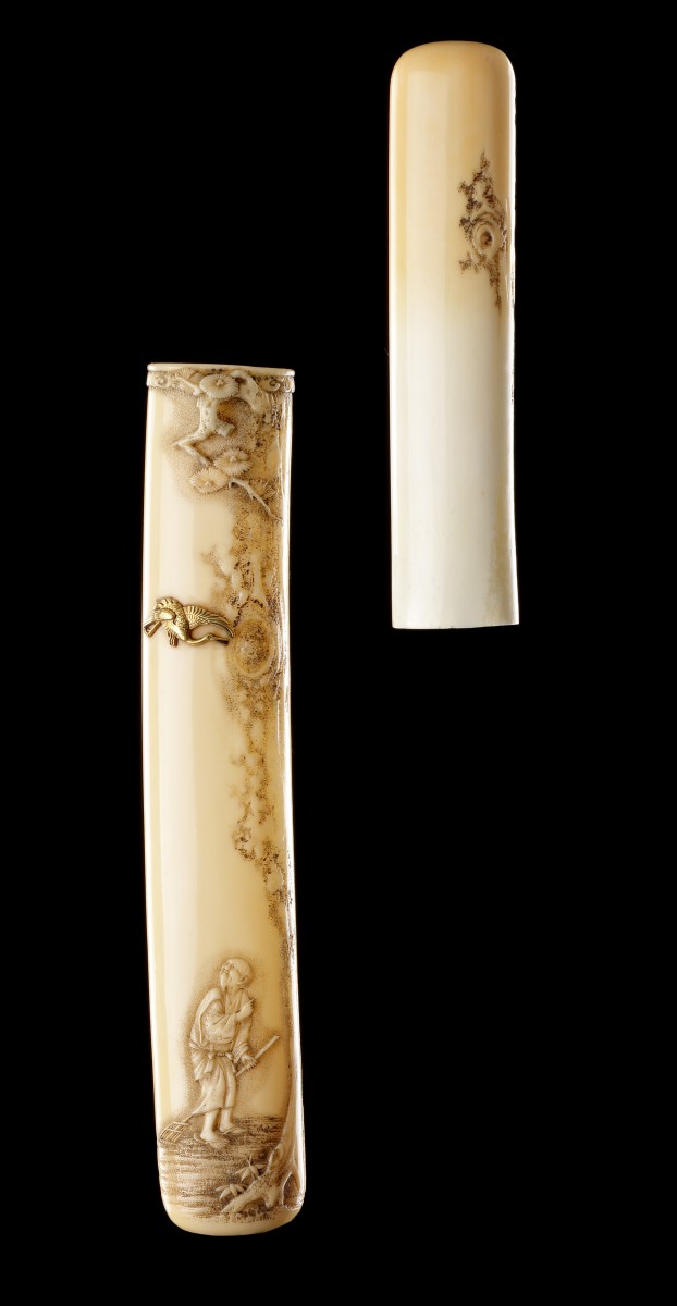 Widely known as ‘Kiseru Zutsu’ pipe cases, these exquisite examples of Japanese decorative art harmoniously blend aesthetic appeal with a distinct purpose. Crafted from diverse materials such as papier-mâché, wood, ivory, bone, and stags’ antler, single-section pipe cases are designated as ‘Senryu-Zutsu’. The origins of tobacco smoking in Japan can be traced back to the latter half of the 16th or the commencement of the 17th century, introduced by the Portuguese and subsequently reintroduced from Korea by soldiers of the Hideyoshi campaign. Despite governmental attempts to suppress this habit, it swiftly gained popularity among both men and women.