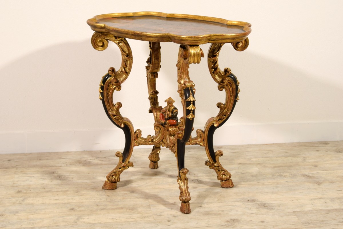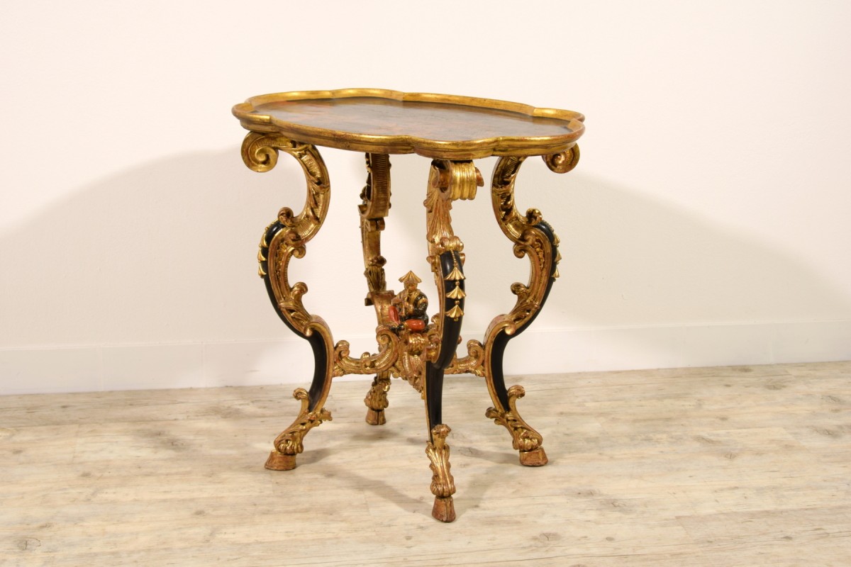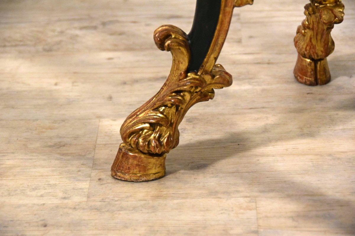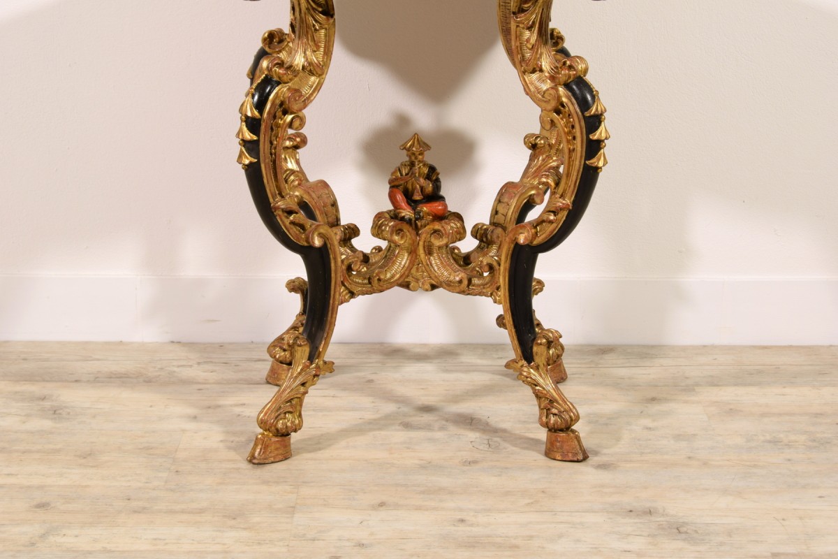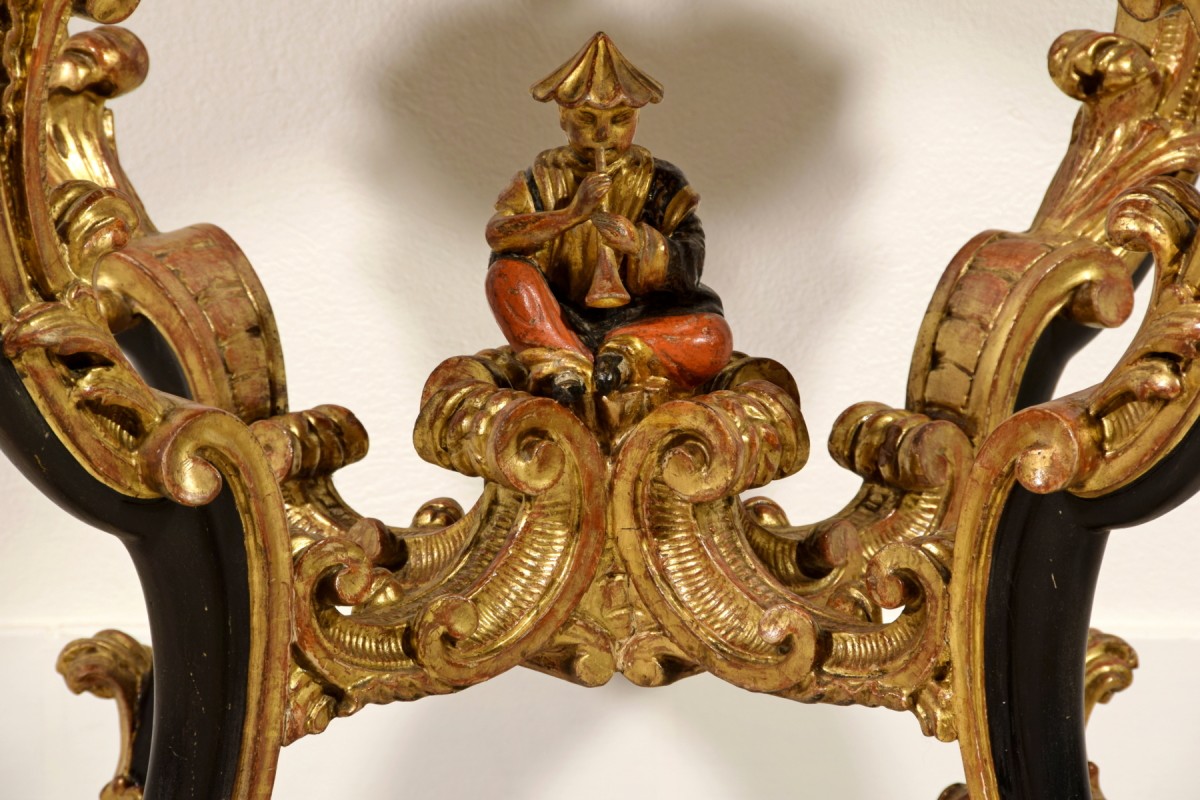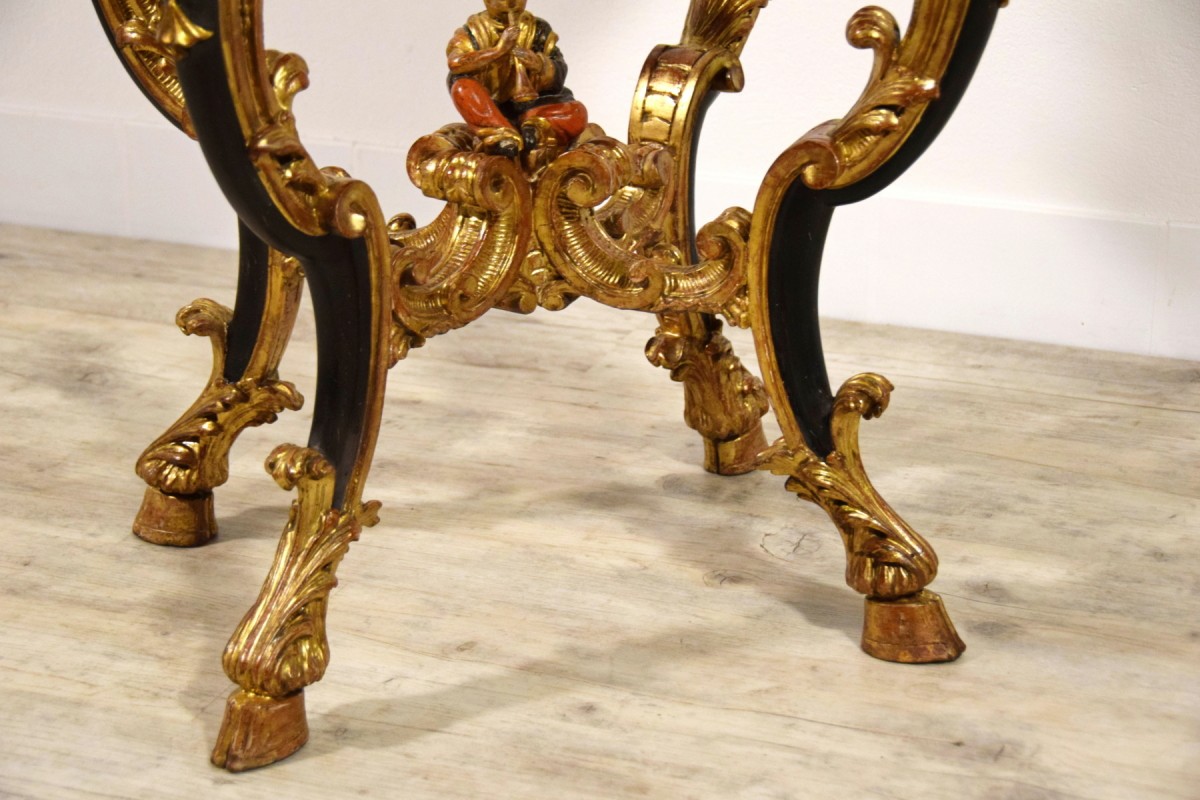 The top rests on four legs that originate from volutes decorated with rocaille phytomorphic elements, carved, gilded and lacquered in black. The curved legs end with goat’s hoof feet richly decorated with leaf reliefs. They are joined together in the center by four spirals ending in a curl on which rests the figure of a sitting cinesino, lacquered in red and black and golden, intent on playing the flute.