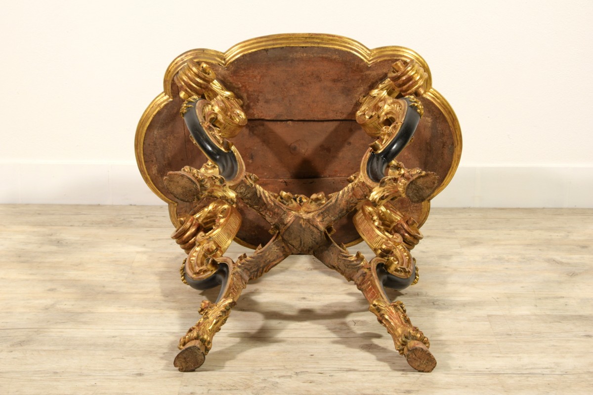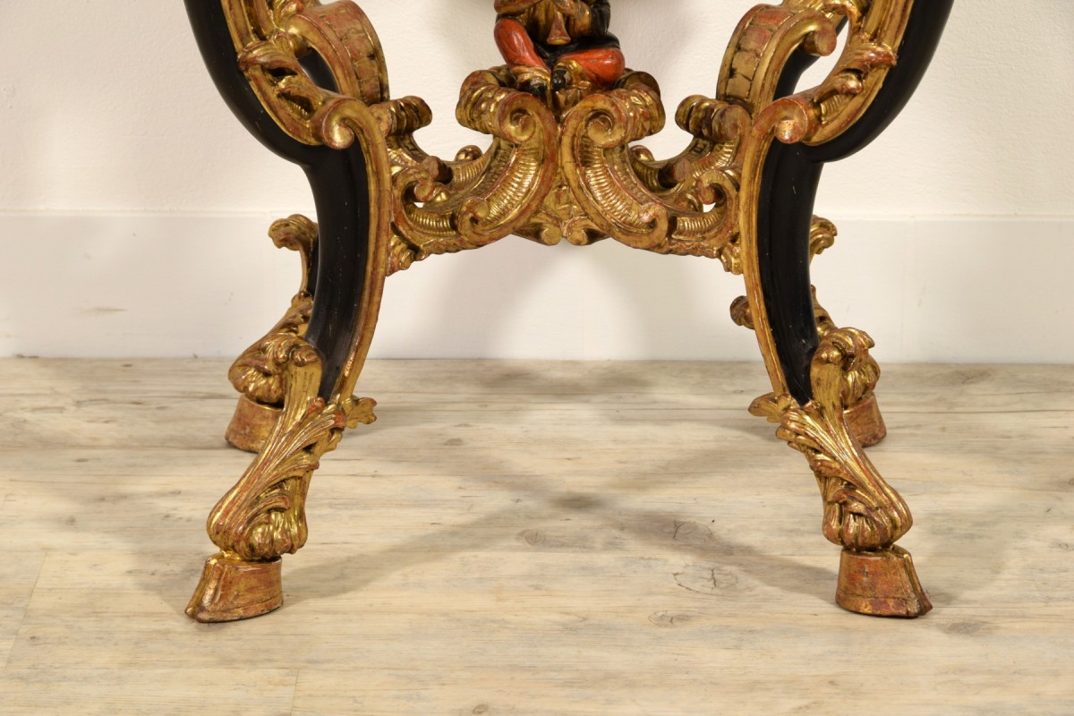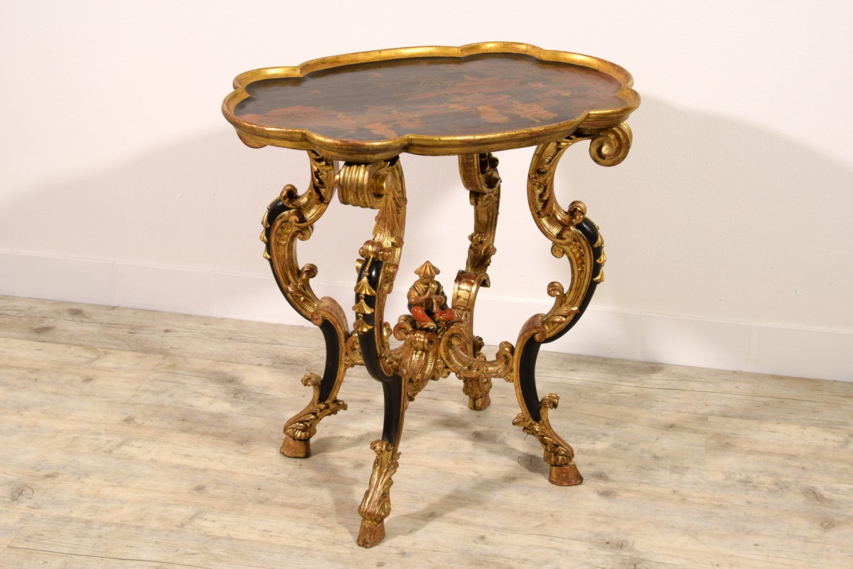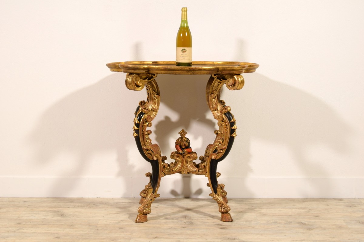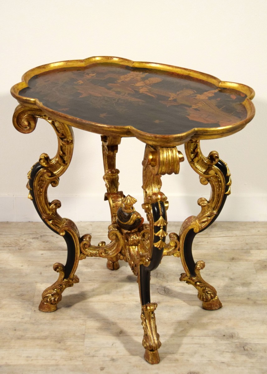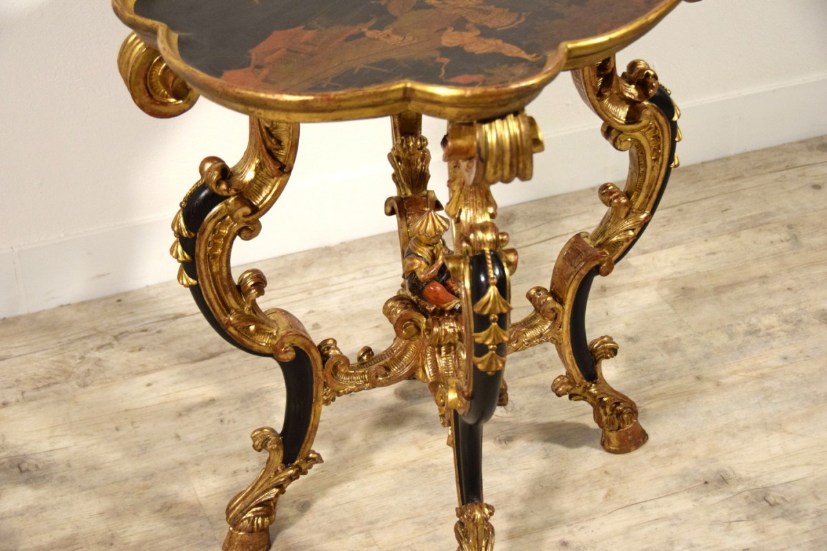 The top rests on four legs that originate from volutes decorated with rocaille phytomorphic elements, carved, gilded and lacquered in black. The curved legs end with goat’s hoof feet richly decorated with leaf reliefs. They are joined together in the center by four spirals ending in a curl on which rests the figure of a sitting cinesino, lacquered in red and black and golden, intent on playing the flute.