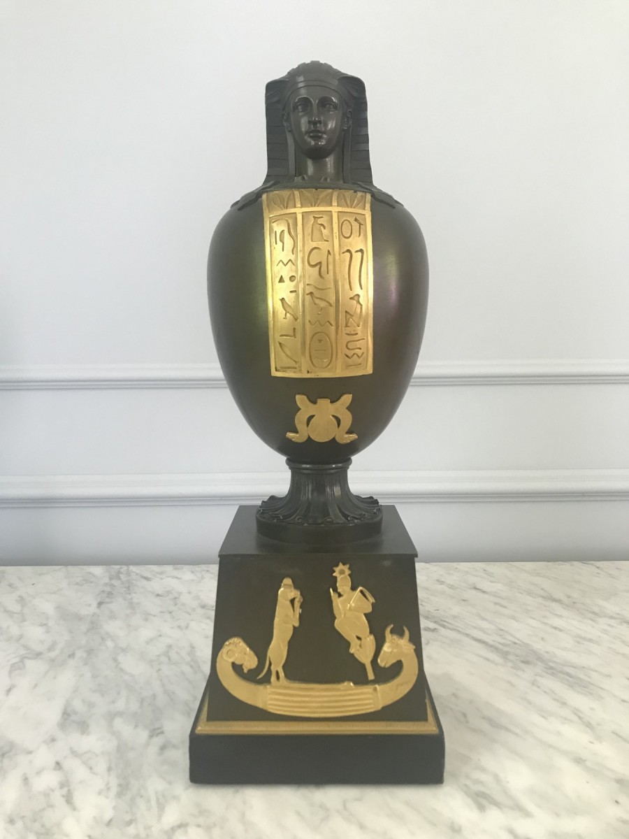 Extremely rare canopic vase in bronze with a medal patina, decorated with hieroglyphs and Egyptian motifs in gilt bronze. It bears a label reading “L. Ravrio, rue des Filles Saint-Thomas, Paris”. Consulate period.
