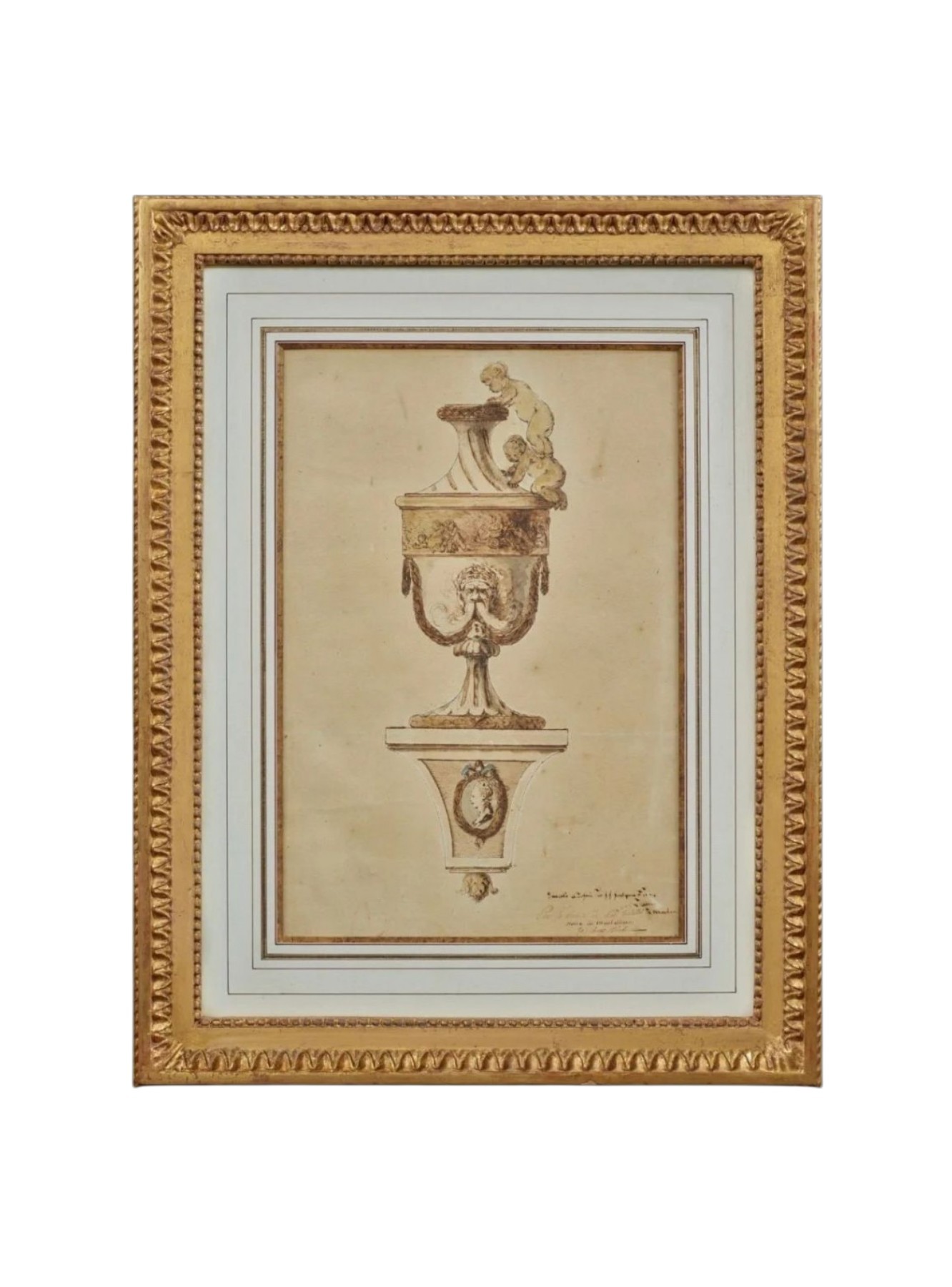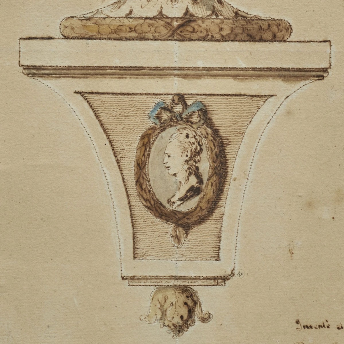 These creations incorporated a variety of decorative motifs, notably figures of children or playful scenes, as seen in the works of Jean-Louis Prieur, Delafosse, and Clodion. The drawing studied here is part of this trend.