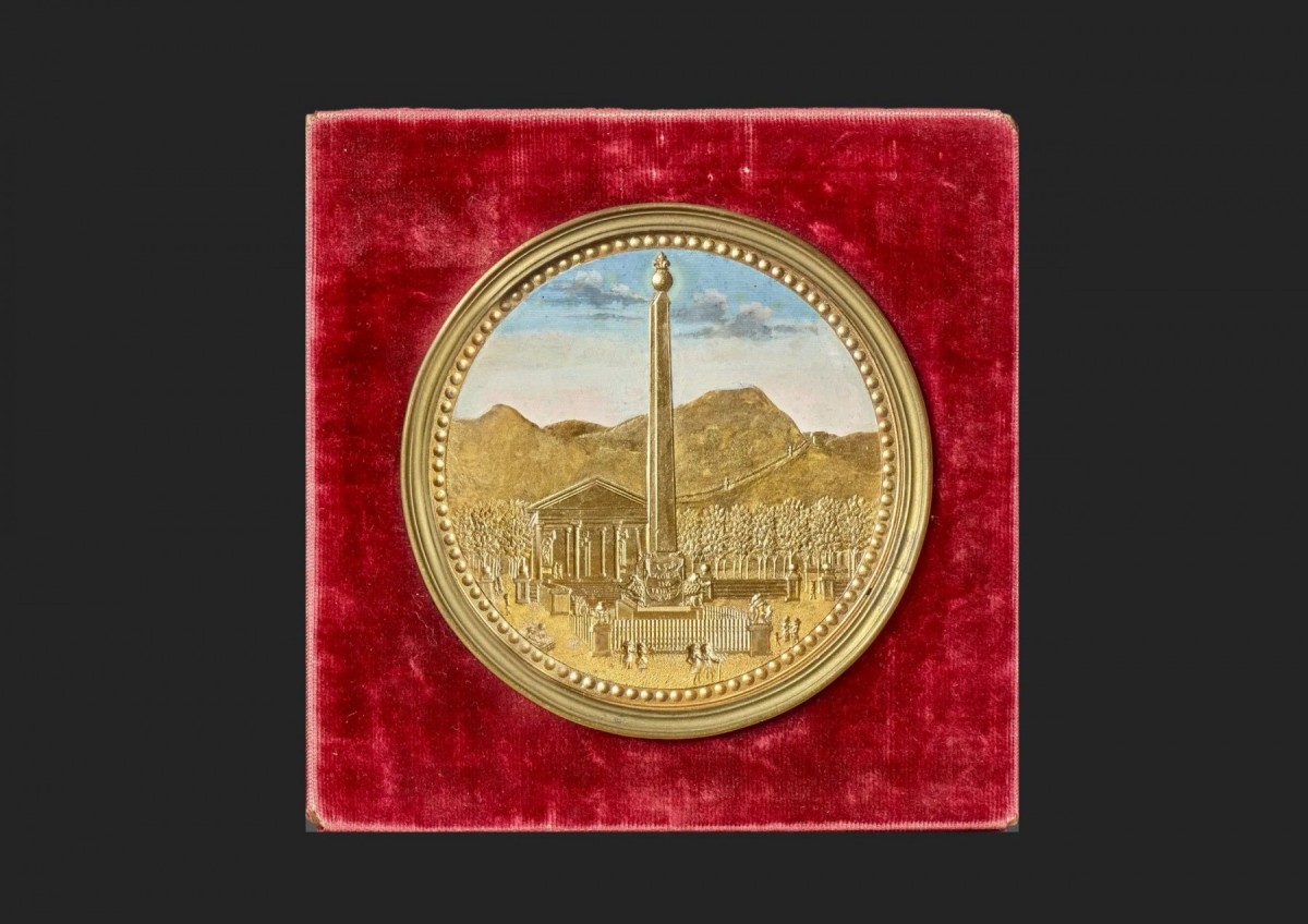 This small compigné medallion represents an urban view. It is made with gouache and enhanced with gold applied to stamped tin foil. The scene depicts the Place de Port-Vendres. On this square stands an obelisk, crowned with a globe and a fleur-de-lys. The base of this monument bears the inscription “To the Glory of Louis XVI”. A fence surrounds it, punctuated at each corner by a shield. In the background, a building reminiscent of an ancient temple, with a triangular pediment and four rows of columns, rises. Several characters are active on the square. Behind them, a line of trees precedes a mountain range. In this painting, the entire scene was stamped, then entirely enhanced with gold. The sky, for its part, was treated with gouache. This composition is surrounded by a beaded frieze and set in a gilded bronze frame, itself inserted in a quadrangular frame covered in red velvet.
