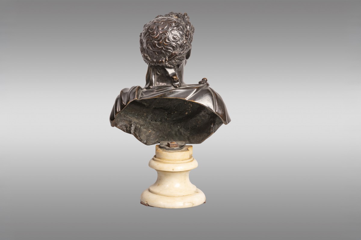 Patinated bronze on a white marble base. Italian work from the beginning of the 19th century